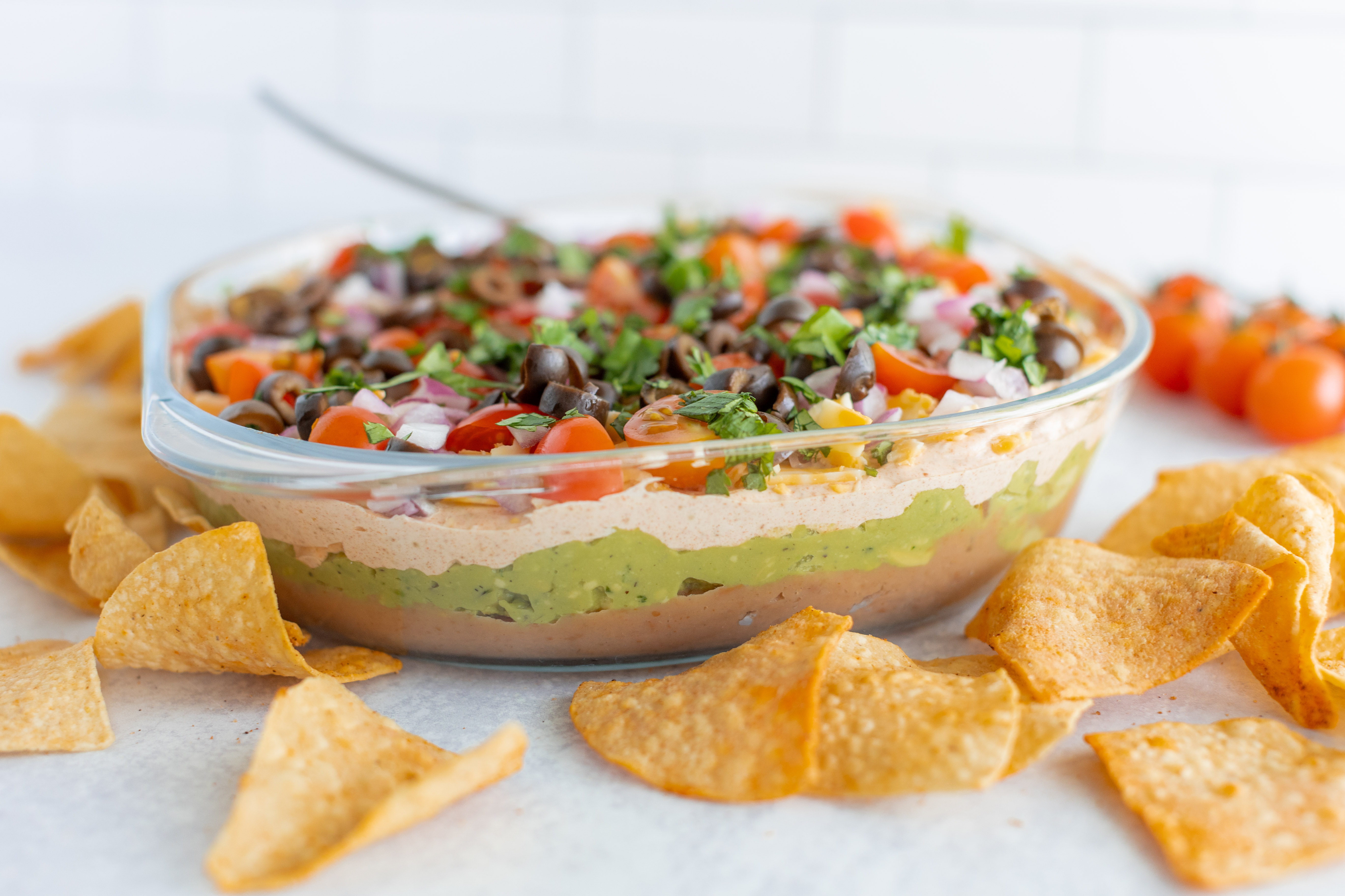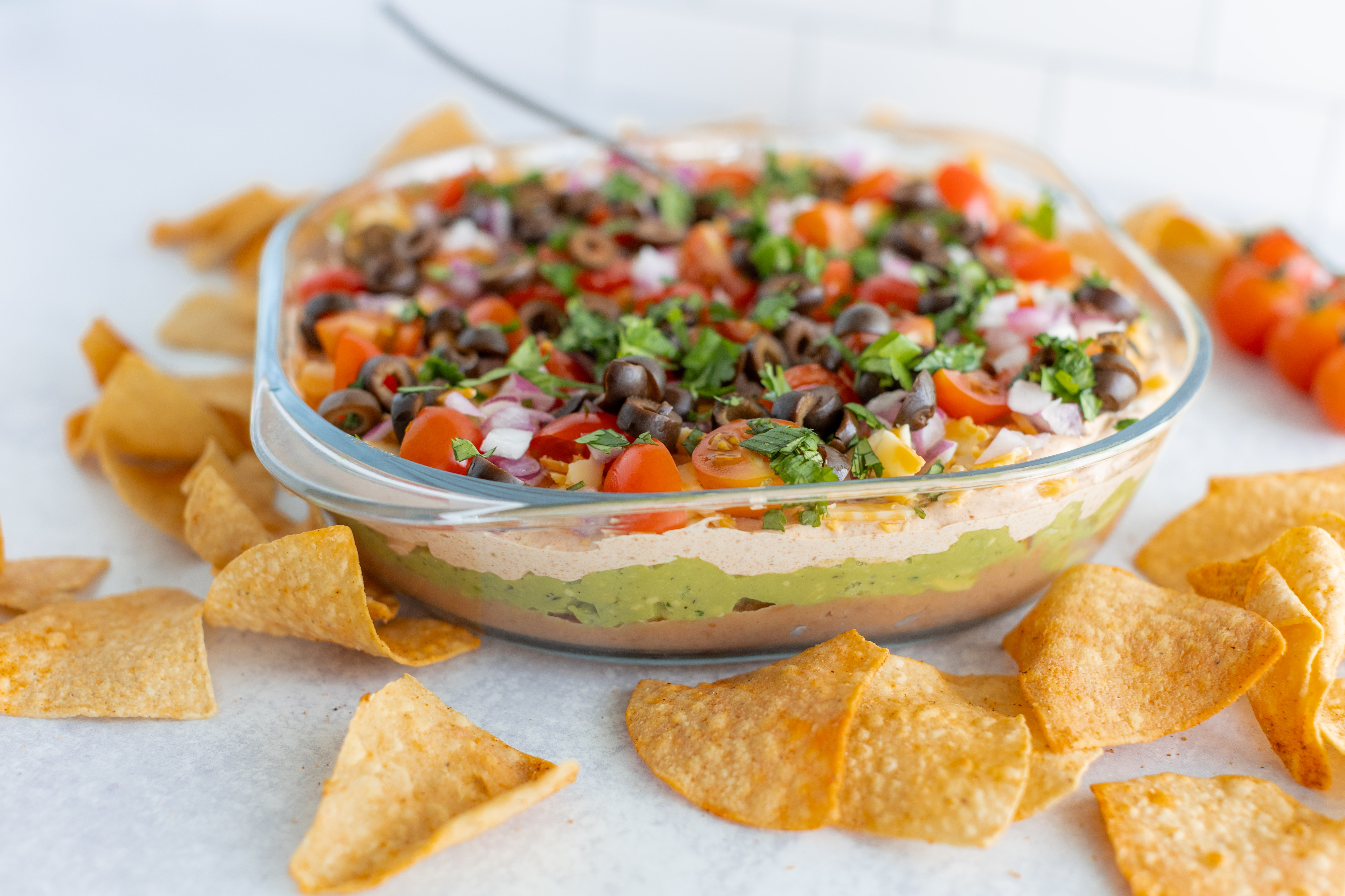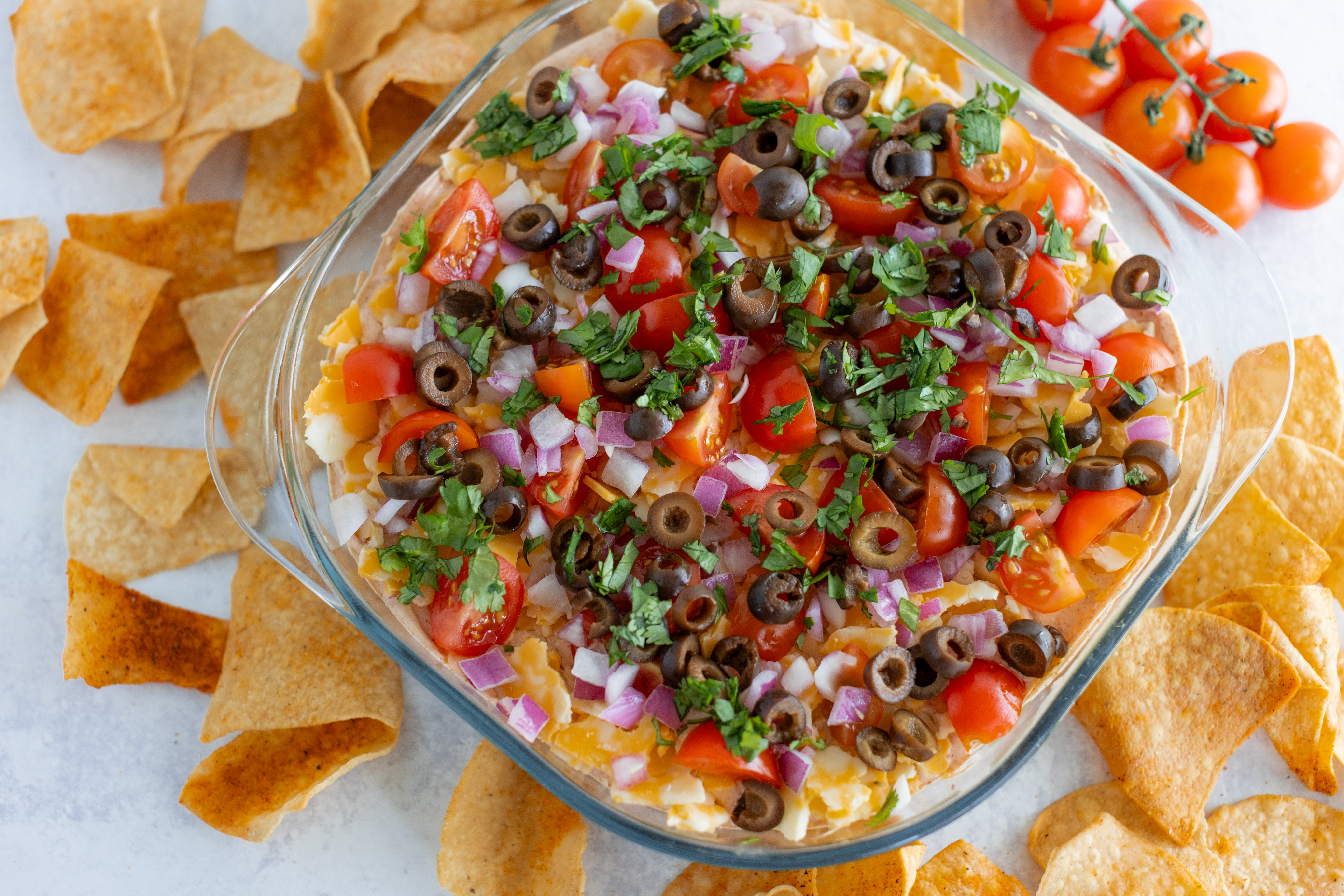 Let this little ace hit a home run at your next gathering! Take 7th-Inning-Stretch Dip around the horn and get the party game started! Layer by layer, savory refried beans, creamy guacamole, taco-seasoned sour cream, salty cheese, juicy tomatoes, earthy black olives, spry onions, and earthy cilantro become the changeup every great get-together needs to score. Load up the flavor bases with 7th-Inning-Stretch Dip and those crispy tortilla chips will never balk at all these game winning tastes! That's a winner!
