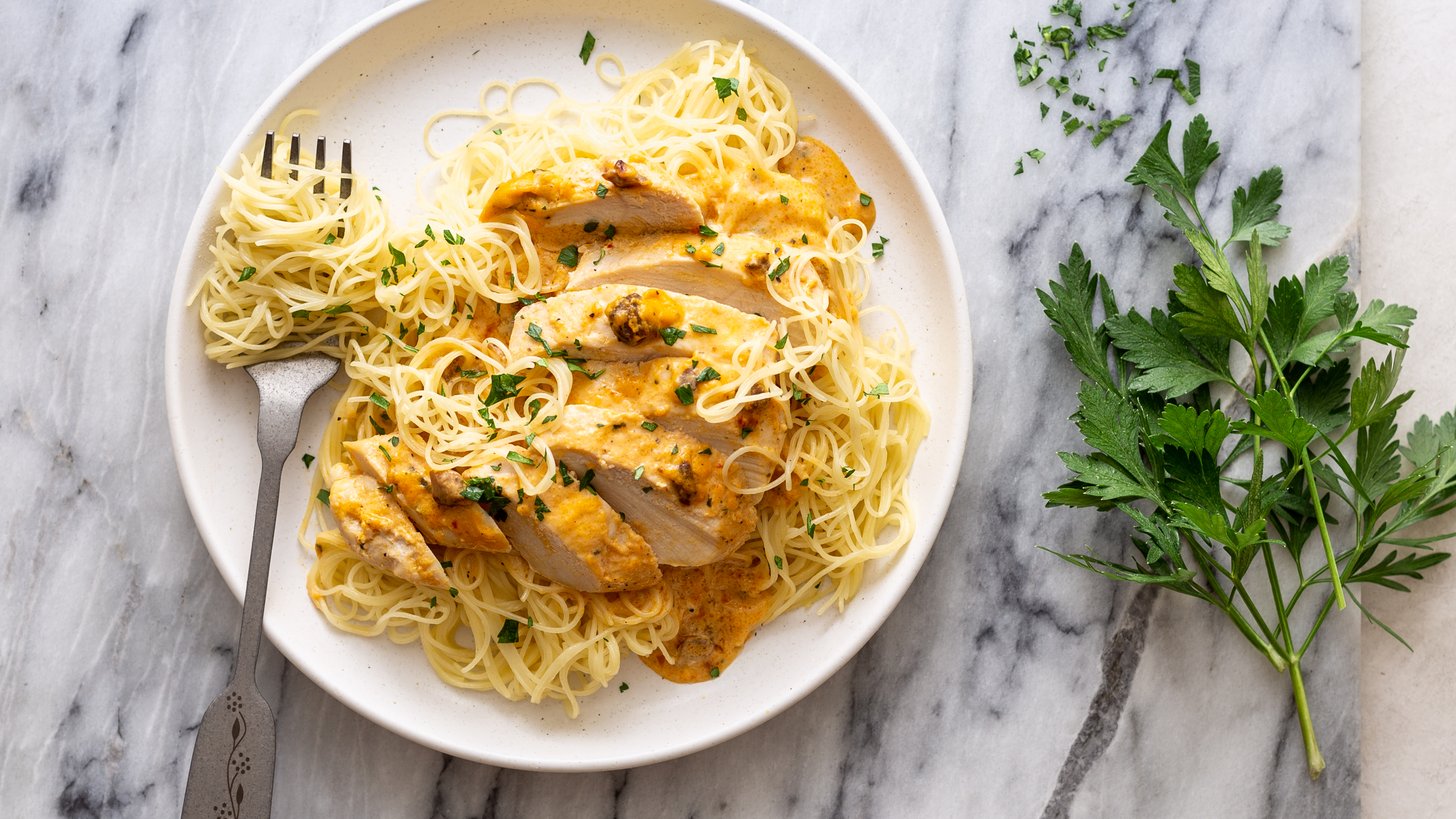 This is a heavenly delicious pasta dish! Angel Chicken Pasta Bake starts with a bed of tender, ethereal angel hair pasta and tops it with a creamy, tangy, herbaceous sauce. And it's within that same sauce that the juicy, savory, and flavorful chicken bakes. Sounds divine, doesn't it? That's the Angel Chicken Pasta Bake for you... it certainly earns its wings!