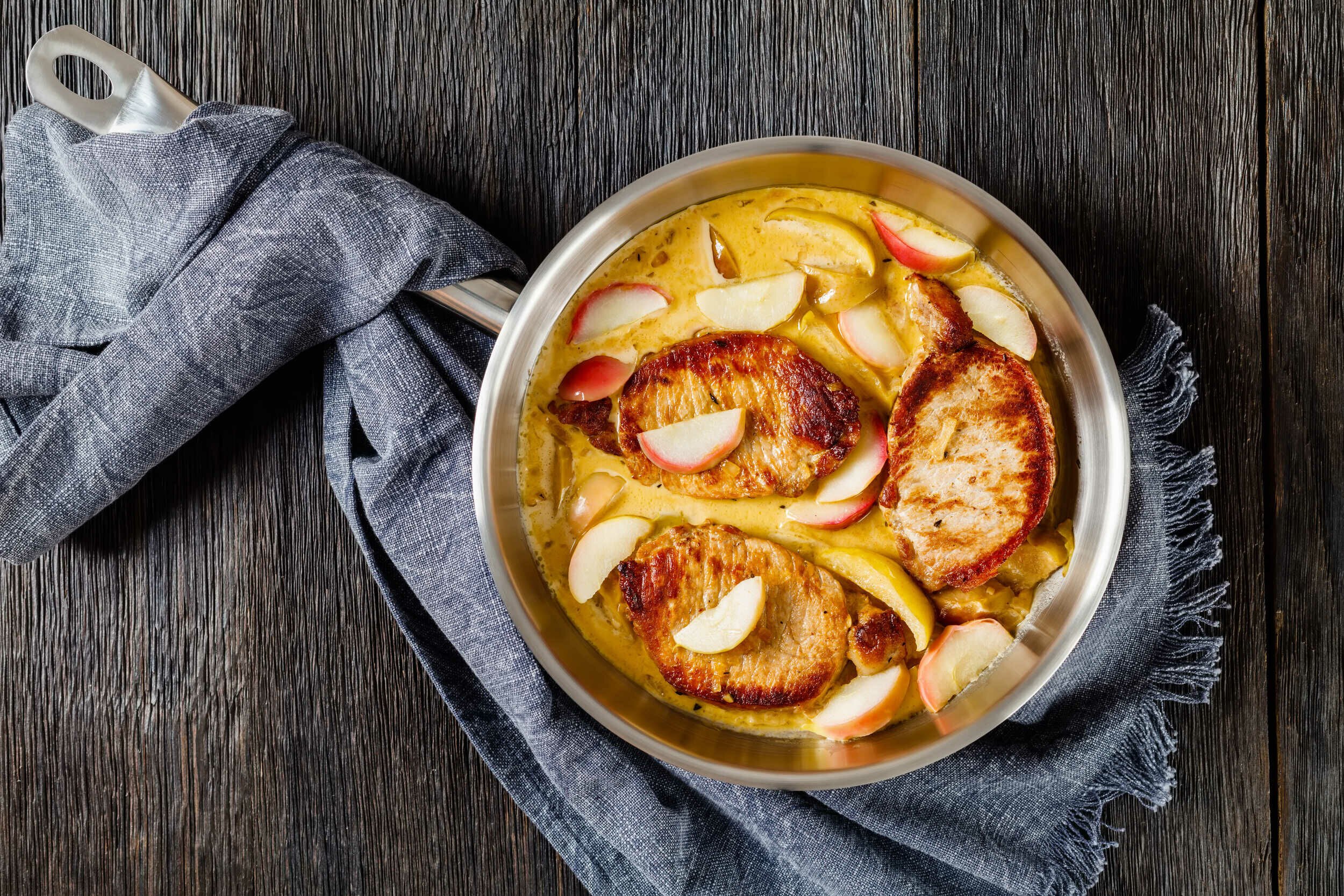 The more mild, almost sweet flavor of pork surprisingly pairs well with the tart sweetness of fresh apples. Apple Pork Chops pair the two together on one plate, marrying the flavors into a sweet and savory blend. Slathered over top with tangy, rich, herby pan sauce, Apple Pork Chops are filling and fanciful with fun flavors for a fantastic dinner. You’ll be licking your lips as you set this main course on the table.