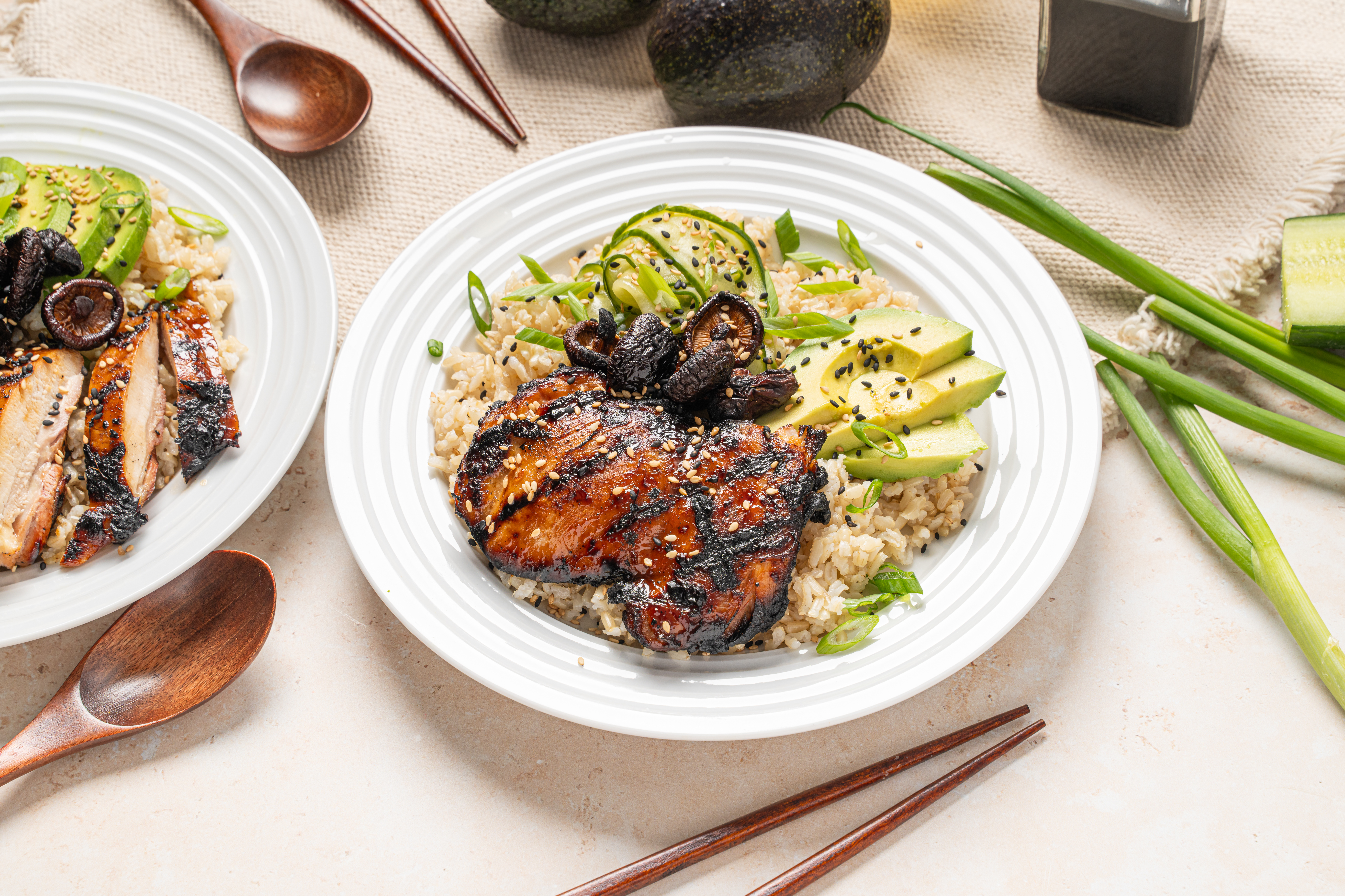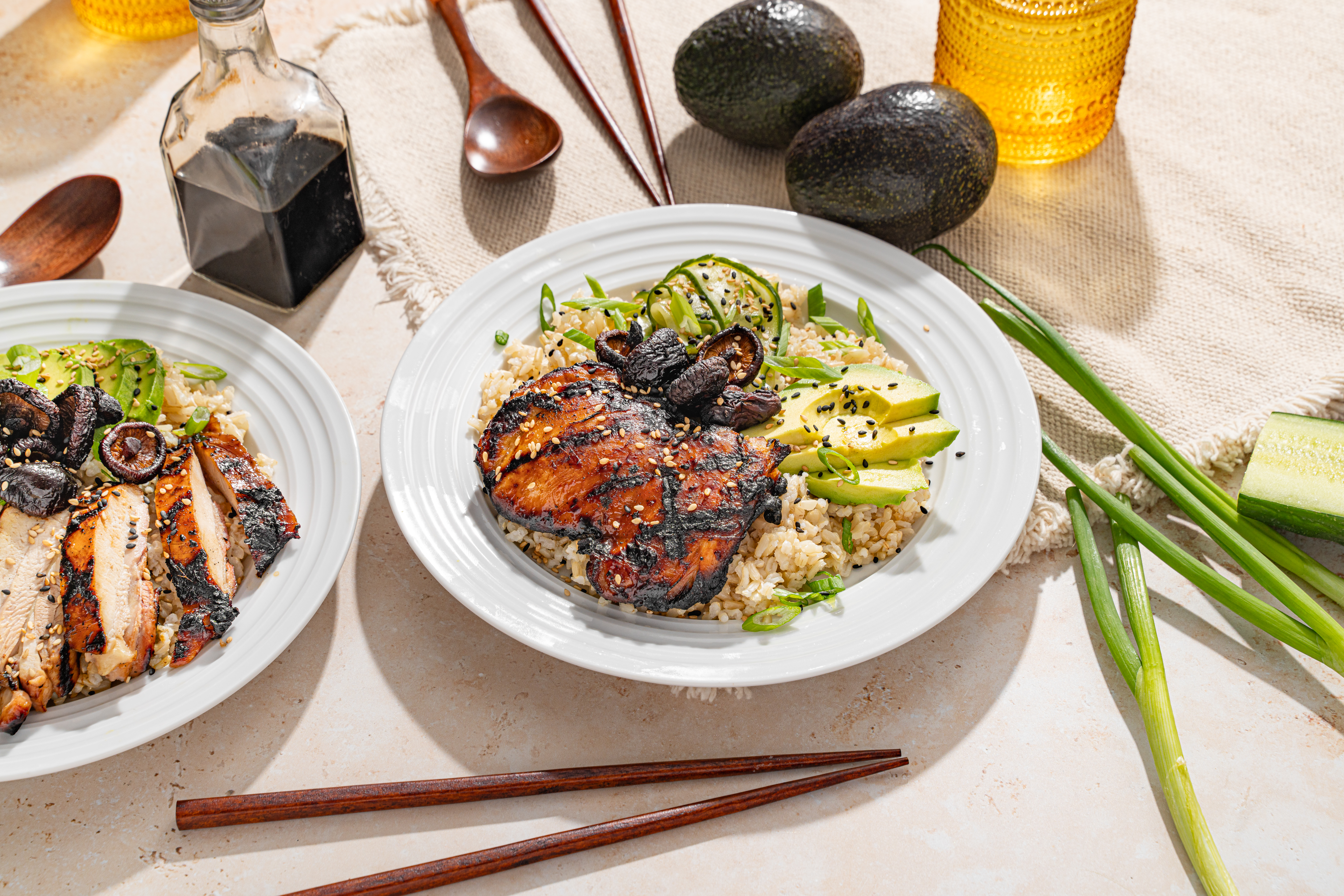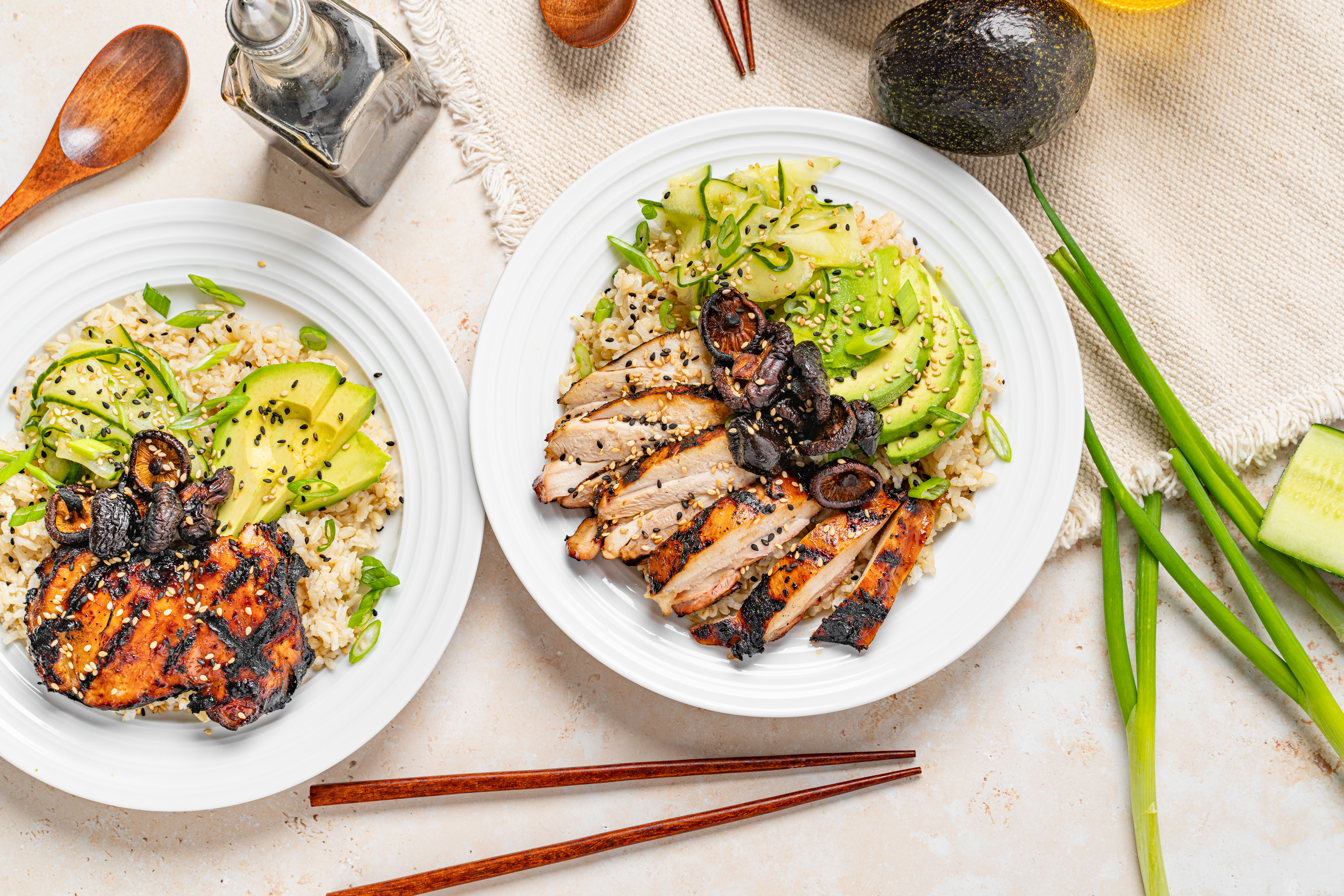 Asian-Style Grilled Chicken doesn't do anything by half-measures. Each bowl is a full meal on its own, with a bed of fluffy rice cushioning piles of wonderfully marinated grilled chicken and a refreshingly sweet and tangy cucumber ribbon salad! Garnished with nutty sesame seeds and creamy avocado, Asian-Style Grilled Chicken is just something special!