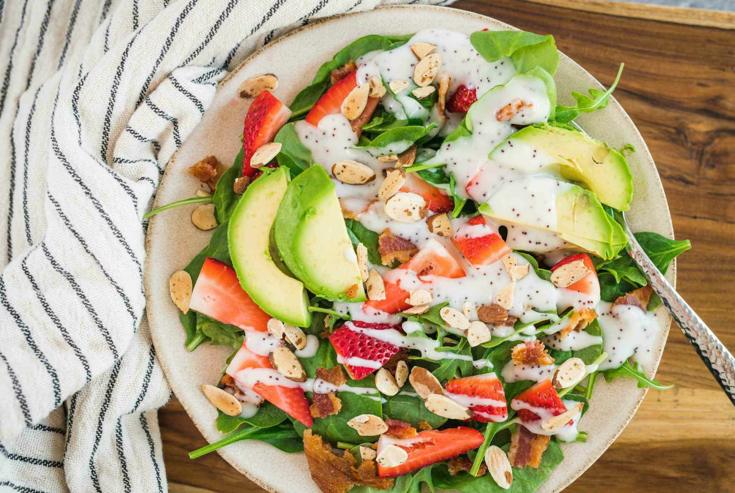 Creamy, crunchy, salty, sweet–this Berrycado Salad is a flavorful summertime tastebud retreat! It starts with a bed of fresh mixed greens, sweet summertime strawberries, hearty sliced avocado, and crispy crumbled bacon. On top is a drizzle of a creamy, dreamy dressing that's sure to delight. Whether sitting by the pool or enjoying a picnic, Berrycado Salad tastes like pure warm weather magic!