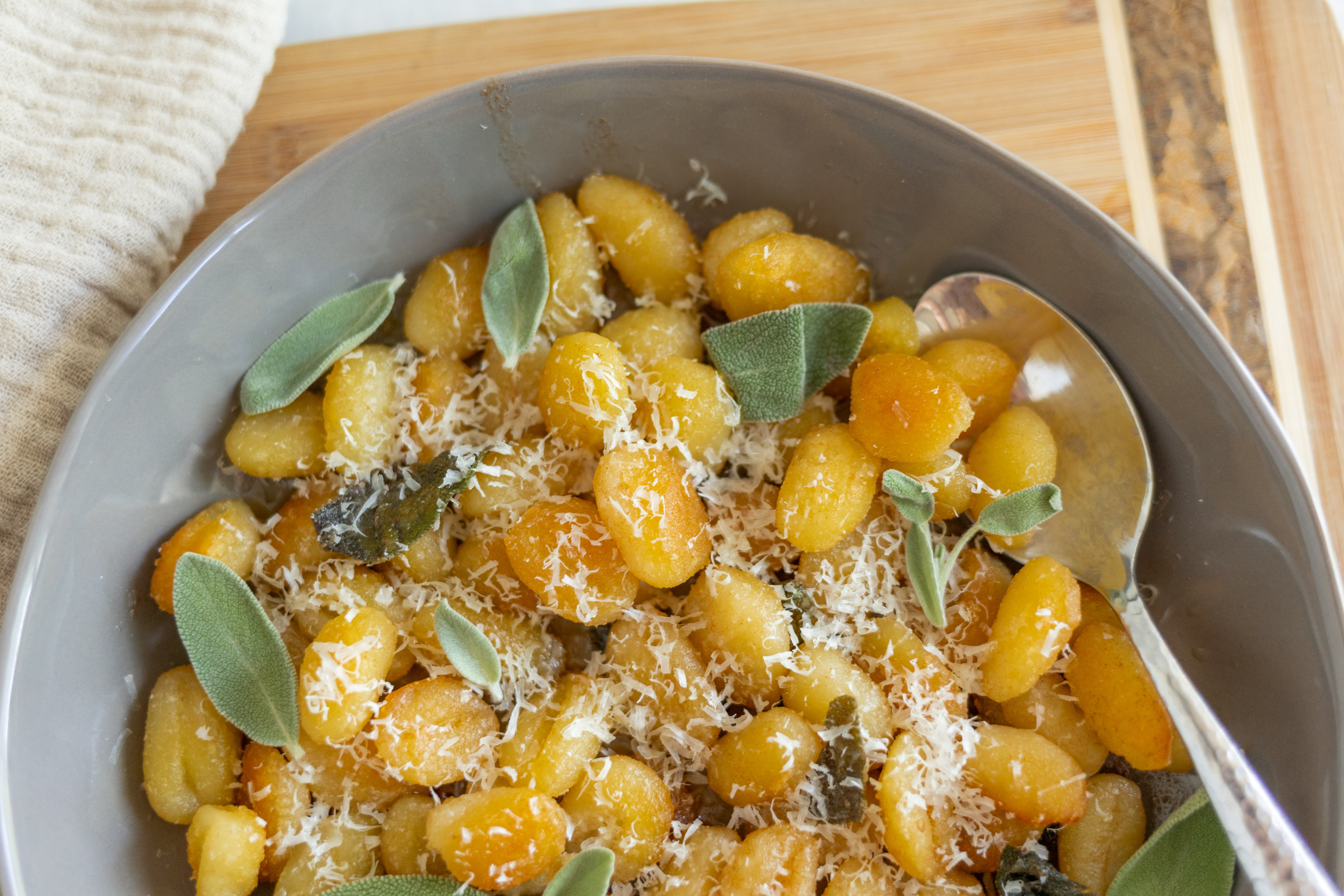 Step 8 -Serve the gnocchi mixture garnished with the parmesan and the extra sage leaves.