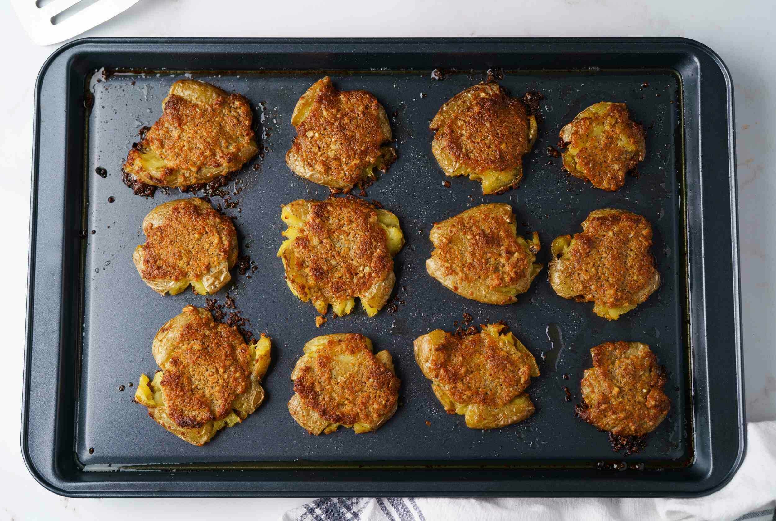 Buttery Smashed Potatoes. It just sounds like a great idea, doesn't it; a change of pace from mashed potatoes or roasted bites? It's, in fact, the best of both worlds: Each one of the Buttery Smashed Potatoes is golden-brown and crispy on the outside, coated with rich butter, sharp parmesan, and aromatic garlic, but fluffy on the inside. It's like the oven fries of your dreams. These potatoes are sure to impress anyone at your dinner table, and the best audience of them all: your own tastebuds!