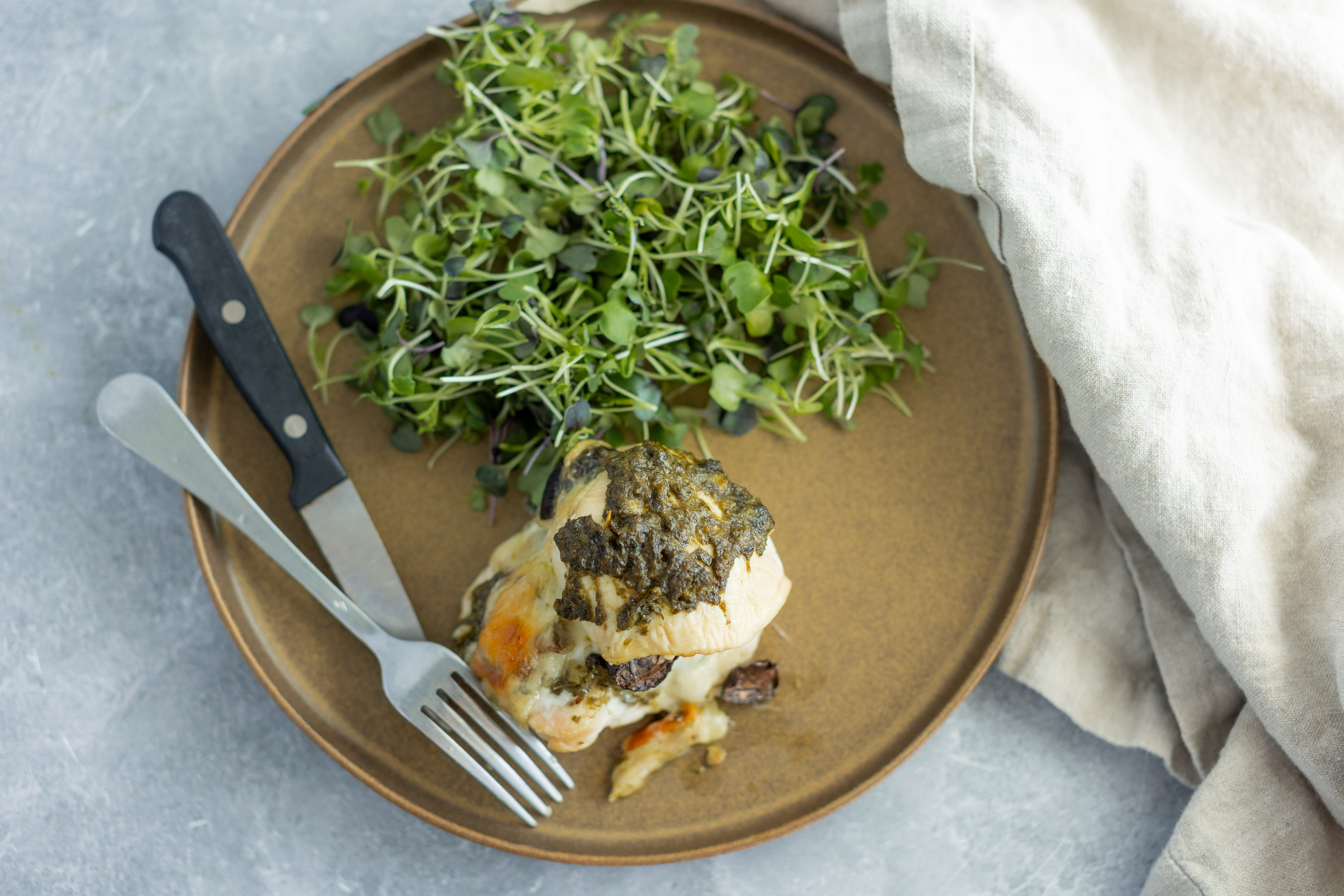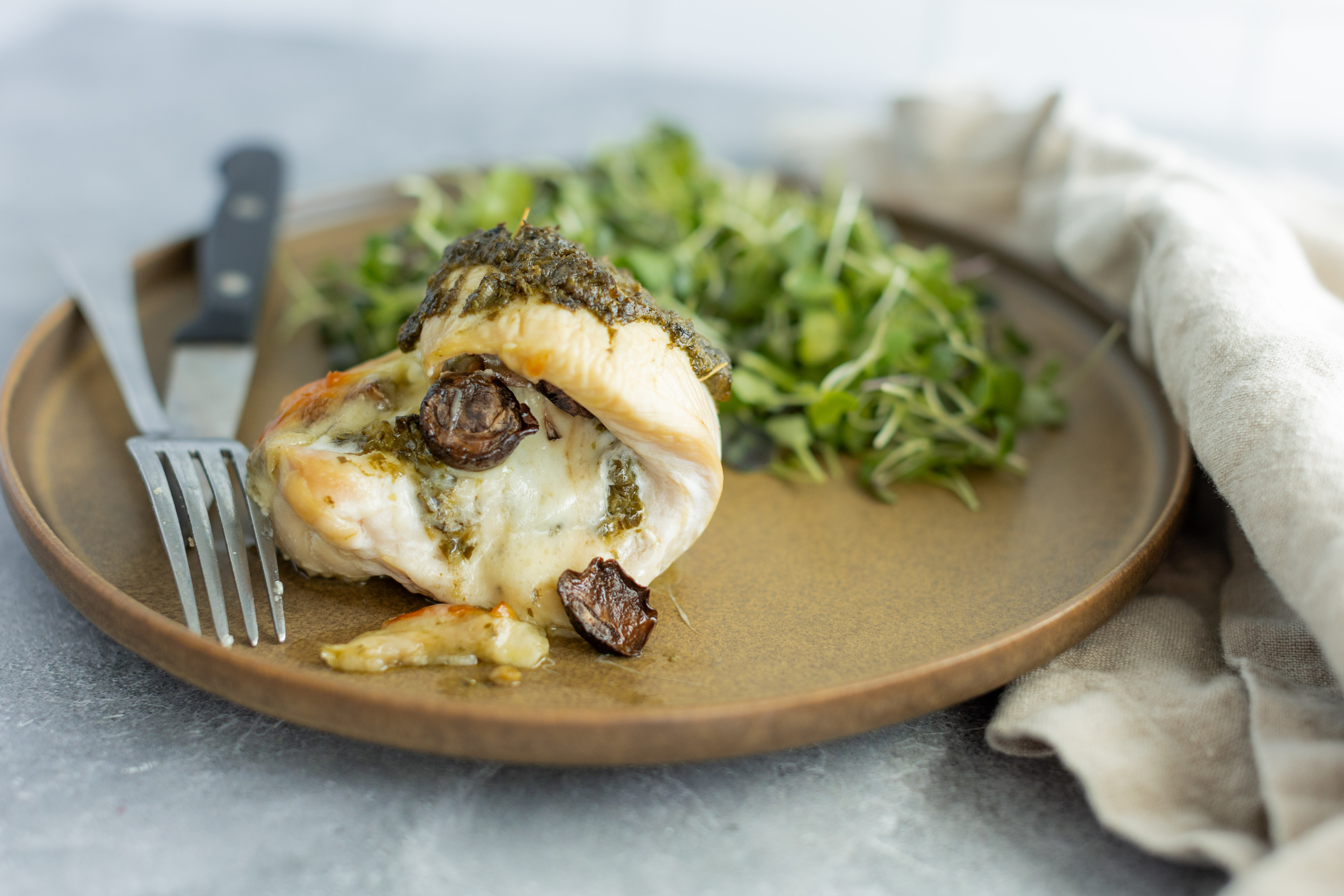 Step 3 -Spread 1/4 cup of the pesto evenly over the chicken halves.