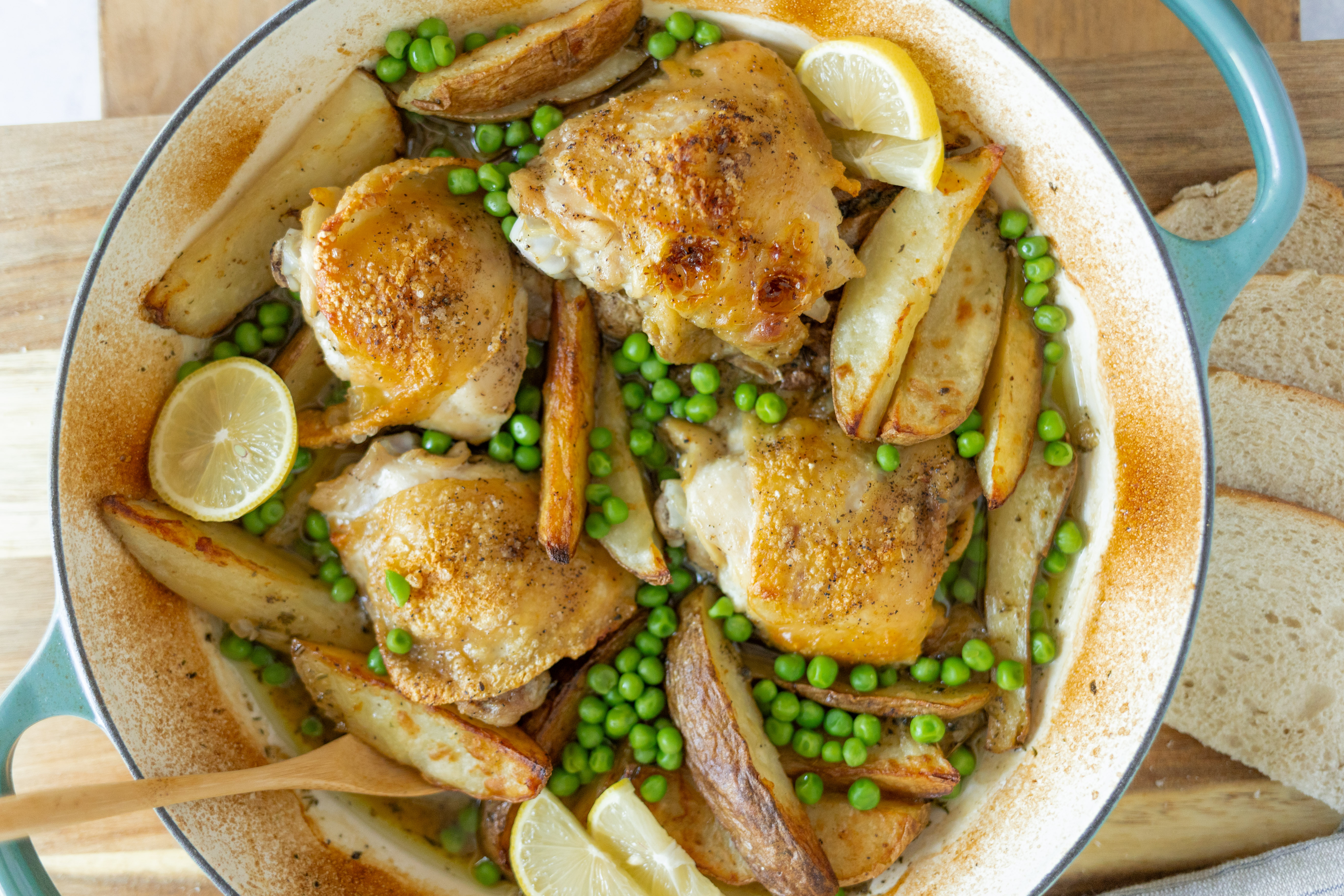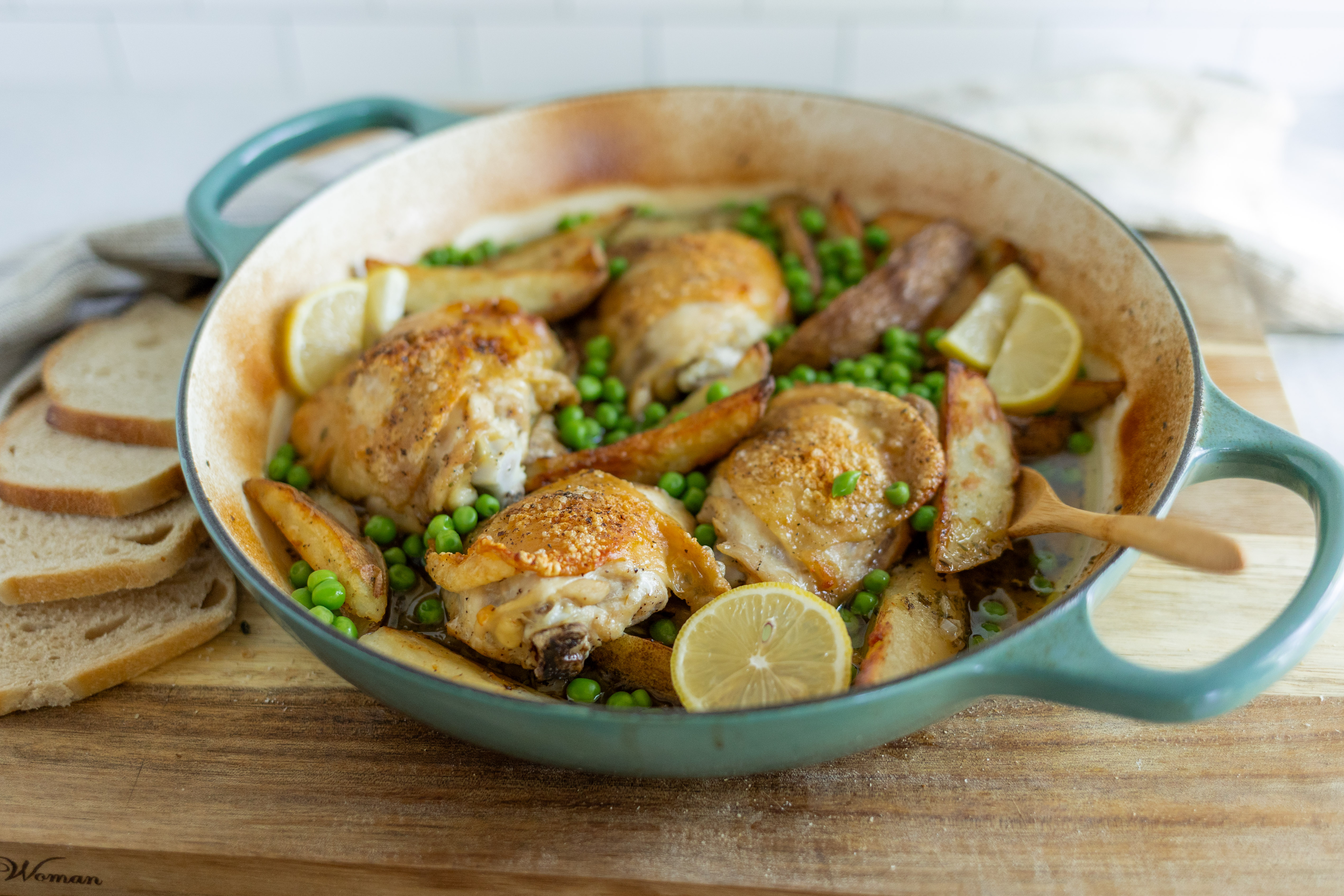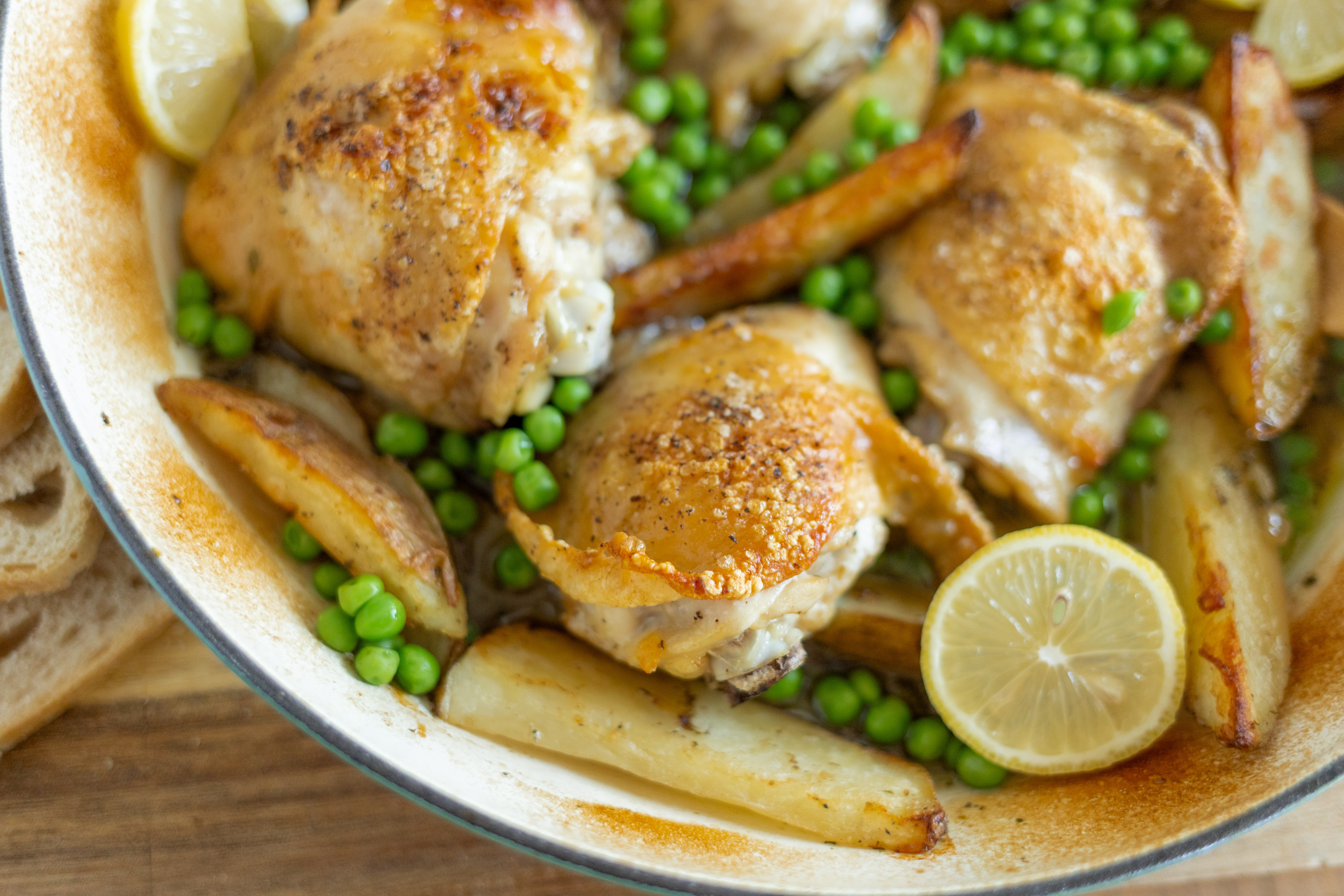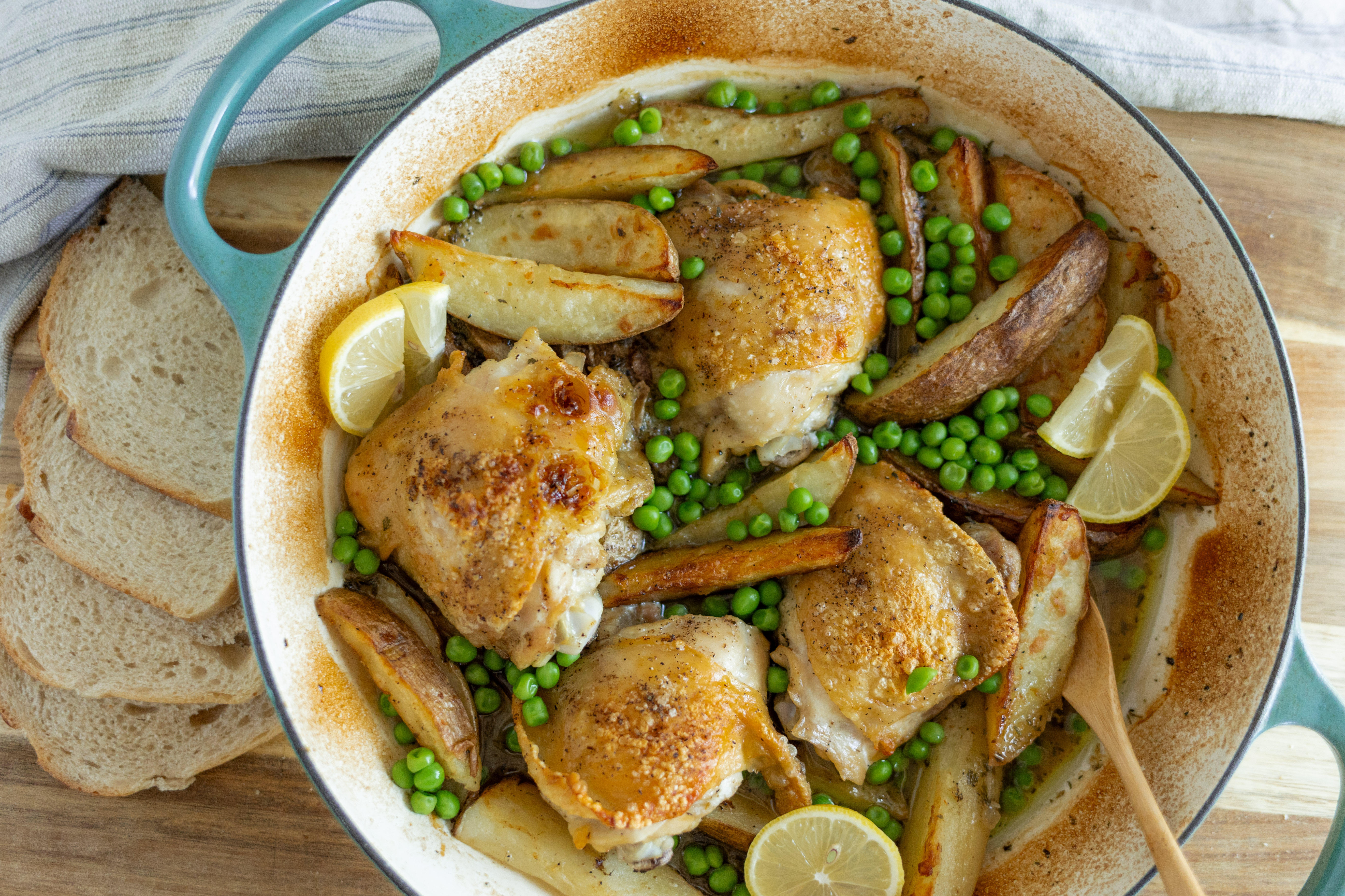 The Chicago classic is back! Chicken Vesuvio features succulent, flavorful chicken thighs, braised in white wine and broth to create a truly savory wonder. To add to the delectable spread, tender potatoes and bright little spheres of green peas are thrown in! It's got zest, it's got pep, and it's got a volcanically delicious taste! The Windy City's own Chicken Vesuvio is ready to erupt with flavor!