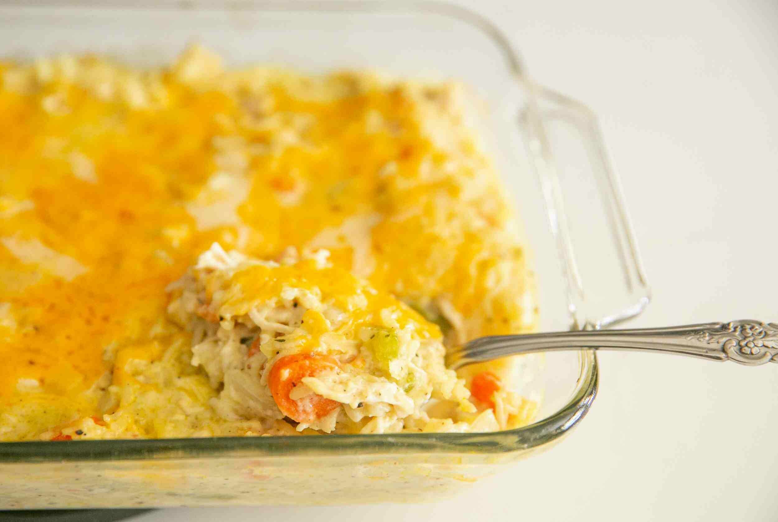 Crack Chicken Casserole is a layered tasting experience — layers upon layer of deep, savory chicken flavor. You can taste creamy chicken in the rice, in the sauce, and in the chicken itself (of course). But Crack Chicken Casserole also bursts with sharp cheddar and bright carrots and peppers, all of which accent and enhance the chicken taste. You can transform a rotisserie chicken into a complete meal in one fell swoop and make it even more delicious with this dish.