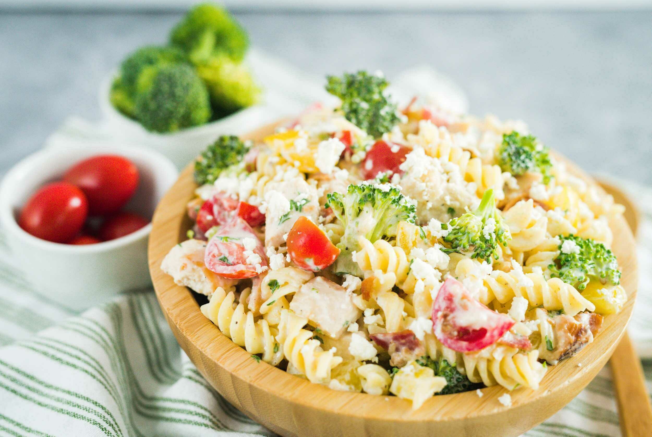 You can never ever, ever have too many cookout recipes on queue. It's fun to impress your friends with a different dish every time, right?! Well, add this Creamy Chicken Pasta Salad to your list pronto because it will definitely be a hit! Bouncy buttery pasta, tender juicy chicken, crispy salty bacon, soft crumbled cheese, and some crunchy fresh veggies are tossed in a creamy and tangy dressing. It's the perfect side to any main and super easy to make. Your people are sure to love and be excited by your Creamy Chicken Pasta Salad!