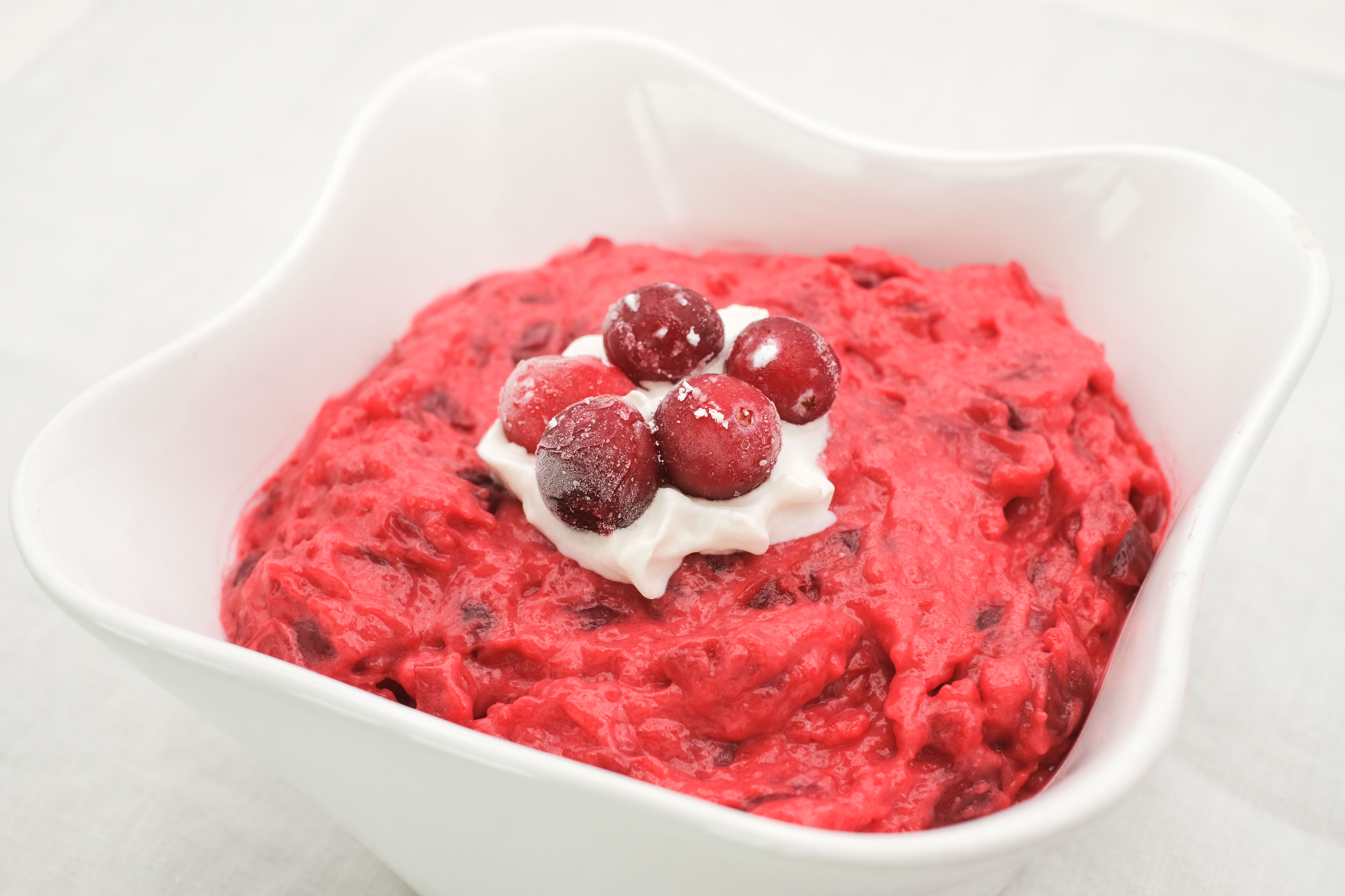 Step 7 -Garnish the cranberry salad with the whipped cream and the candied raspberries.