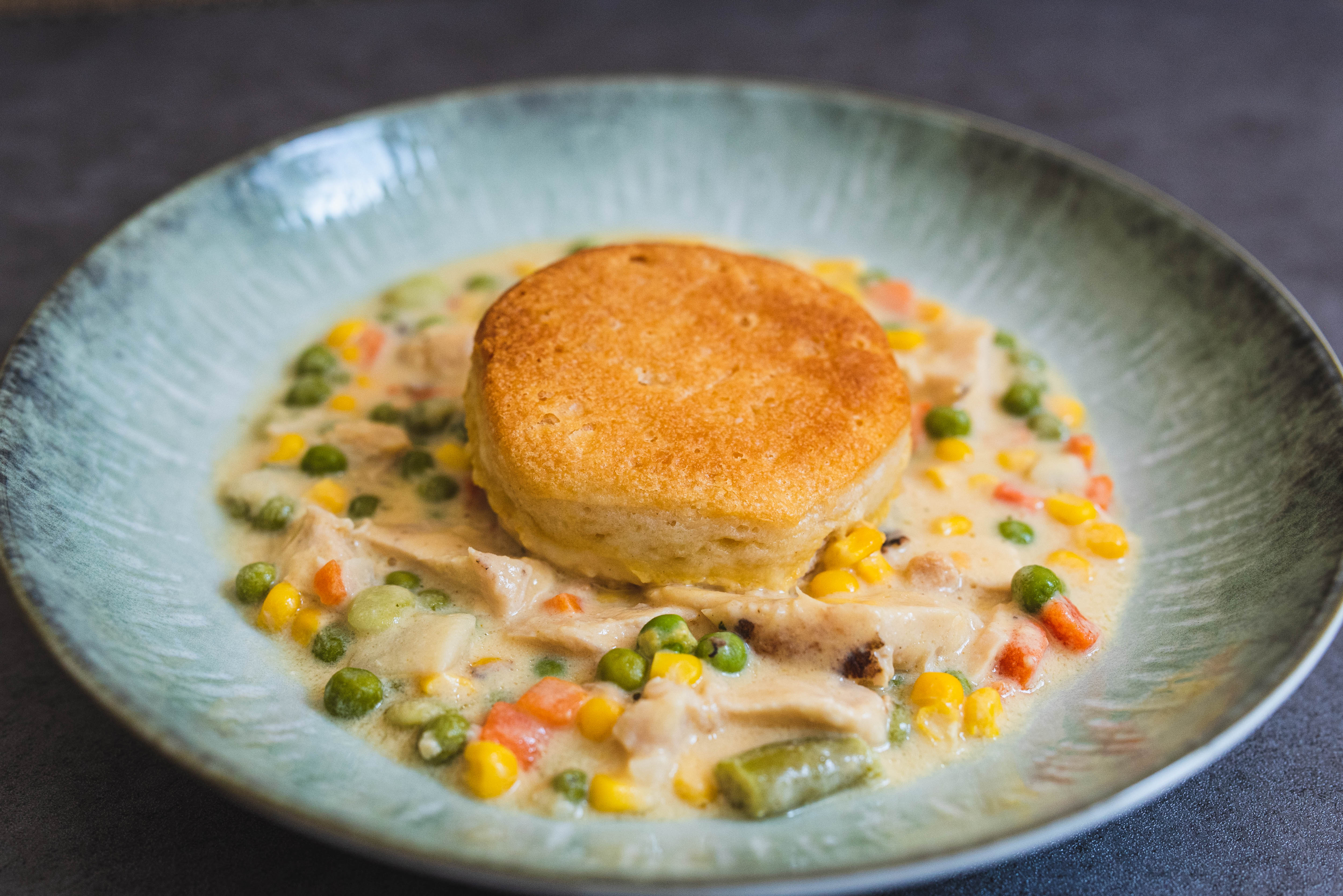 This Easy Chicken Pot Pie Bake is just like momma's! Well... except you don't have to spend the entire day in the kitchen. It's still got that perfectly seasoned savory roux, swimming with all your favorite garden veggies and cubes of tender chicken. Rather than making it from scratch, we take a little short cut with the pie crust and swap it for some buttery, fluffy canned biscuits, but we like them just as much! With this comforting concoction, you can get a taste of momma's kitchen in under 40 minutes. Think of all the things you can do with that extra time! Easy Chicken Pot Pie Bake brings you the tastes of your childhood without too much hassle... what a treat!