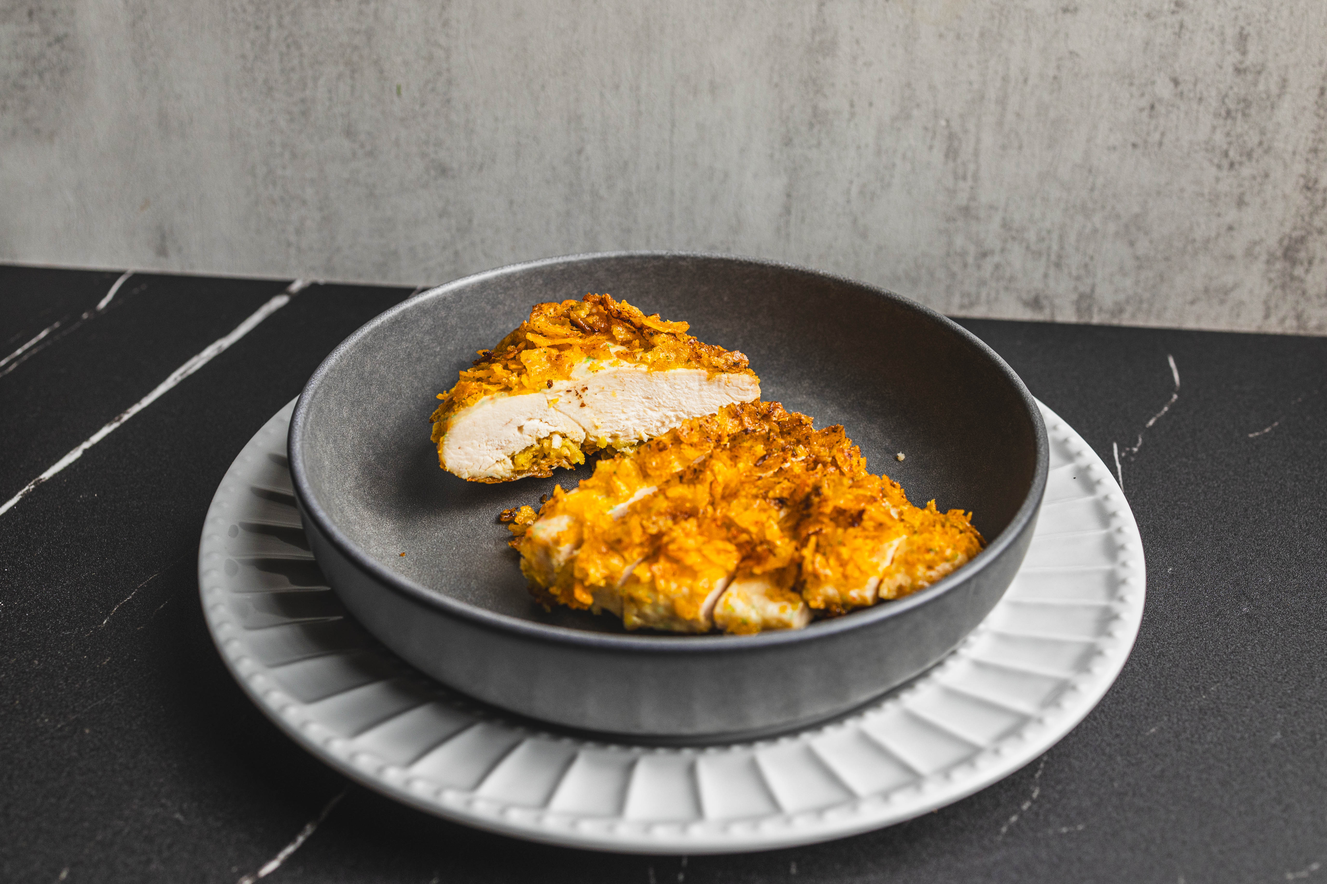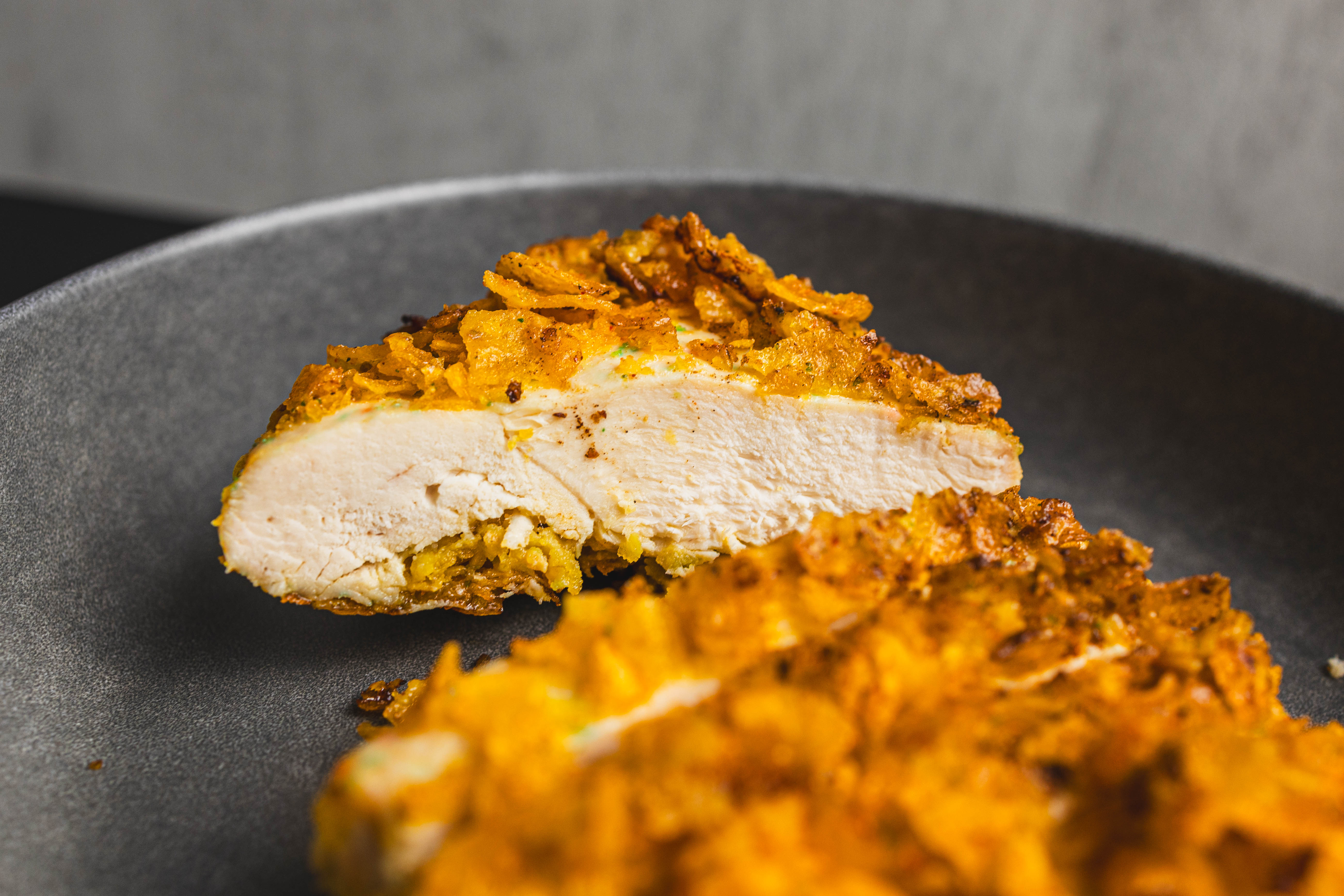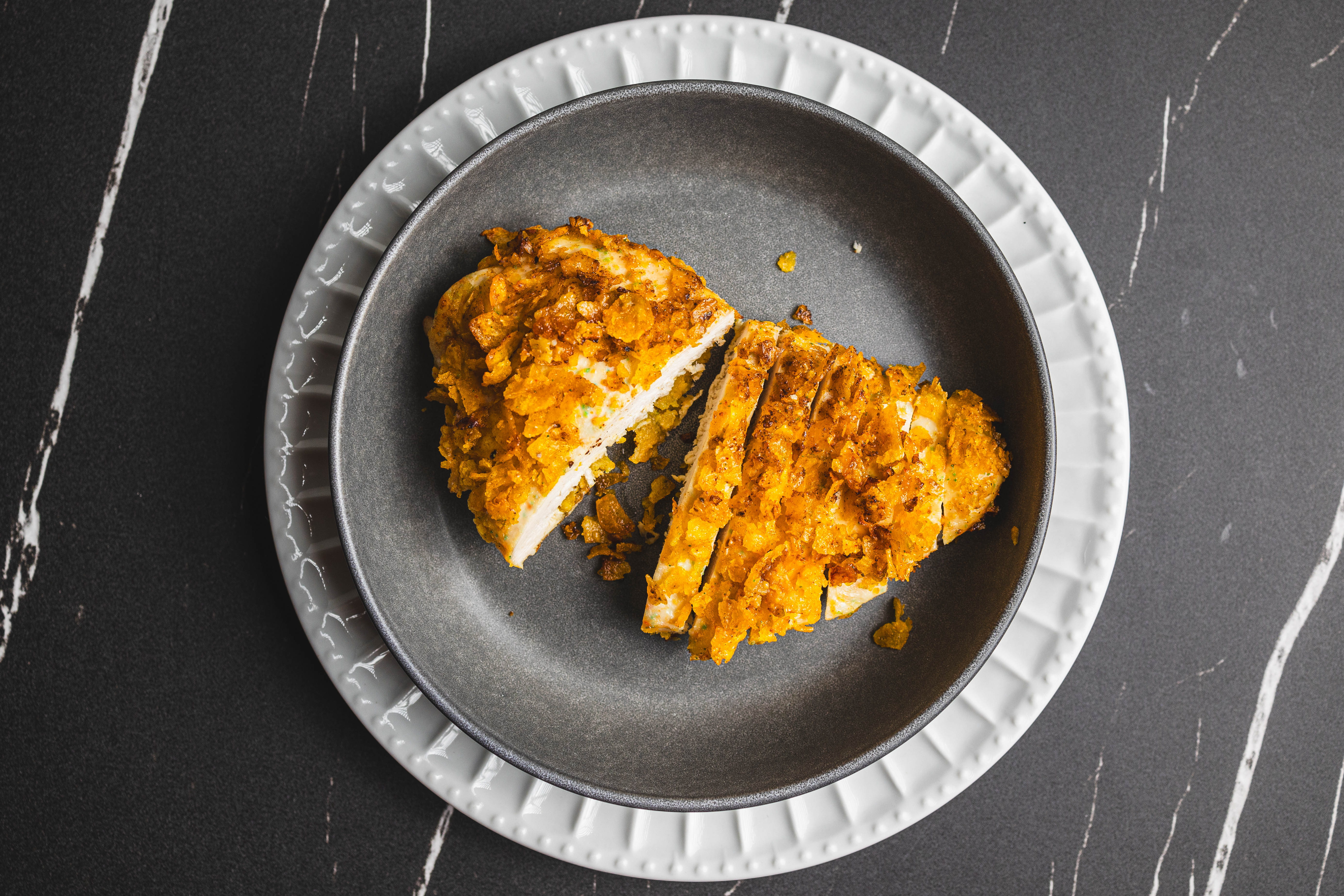 Step 7 -Dip each of the mayo-coated chicken breasts into the crushed tortilla chips and flip to thoroughly coat each side.