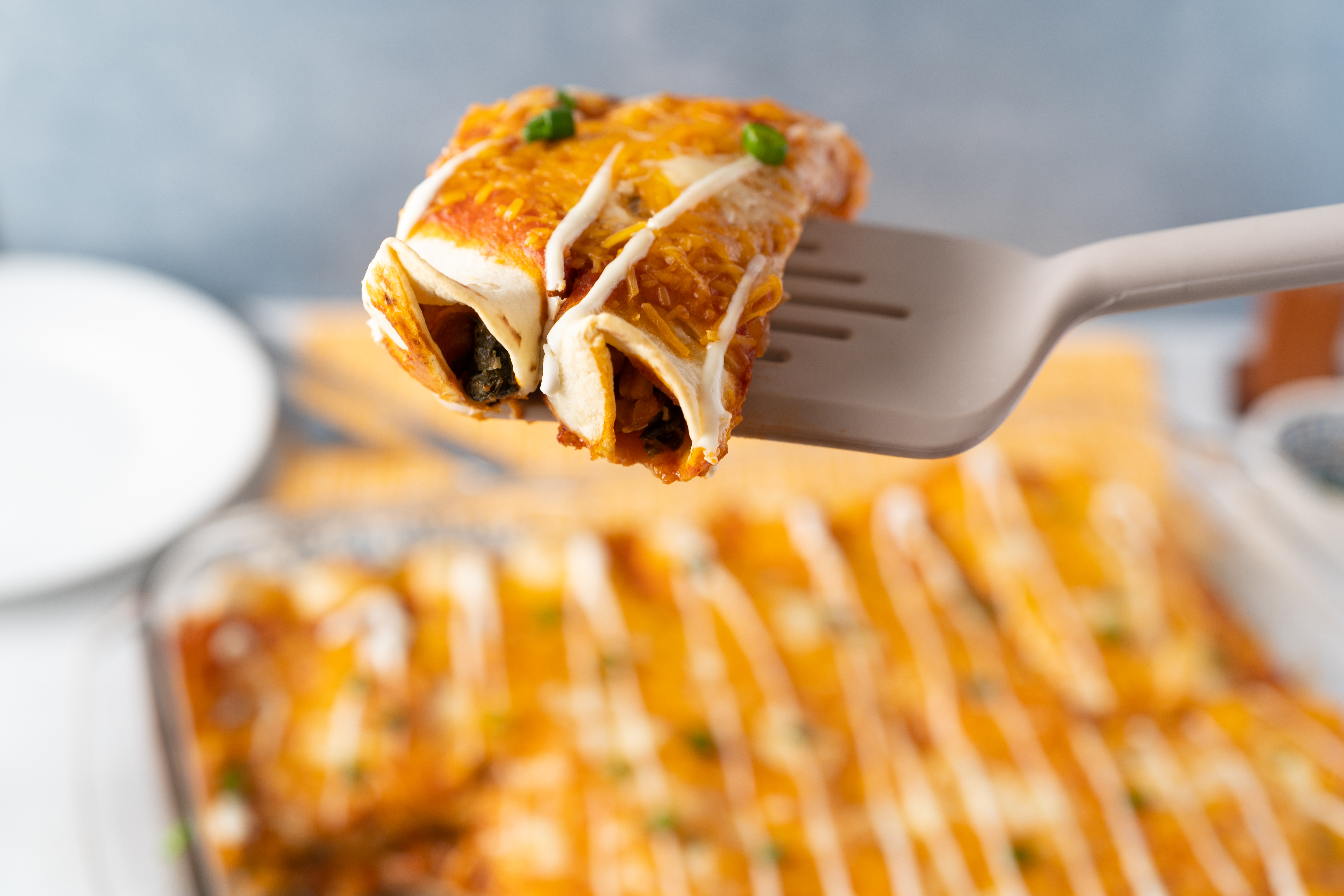 Making vegetarian food that tastes fantastic shouldn't be a challenge. In fact, it should be a snap, just like making these Easy Vegetarian Enchiladas! These rolls of rollicking-good flavor, each filled with creamy, tangy, hearty beans, cheese, and sour cream, perfectly paired with the bright and spicy tomato sauce, will have you rolling with the good times! A little extra melted cheese on top and a drizzle of a creamy lime sauce rounds out Easy Vegetarian Enchiladas and makes them endlessly enjoyable! You might just make this vegetarian triumph a regular in your dinner rotation!