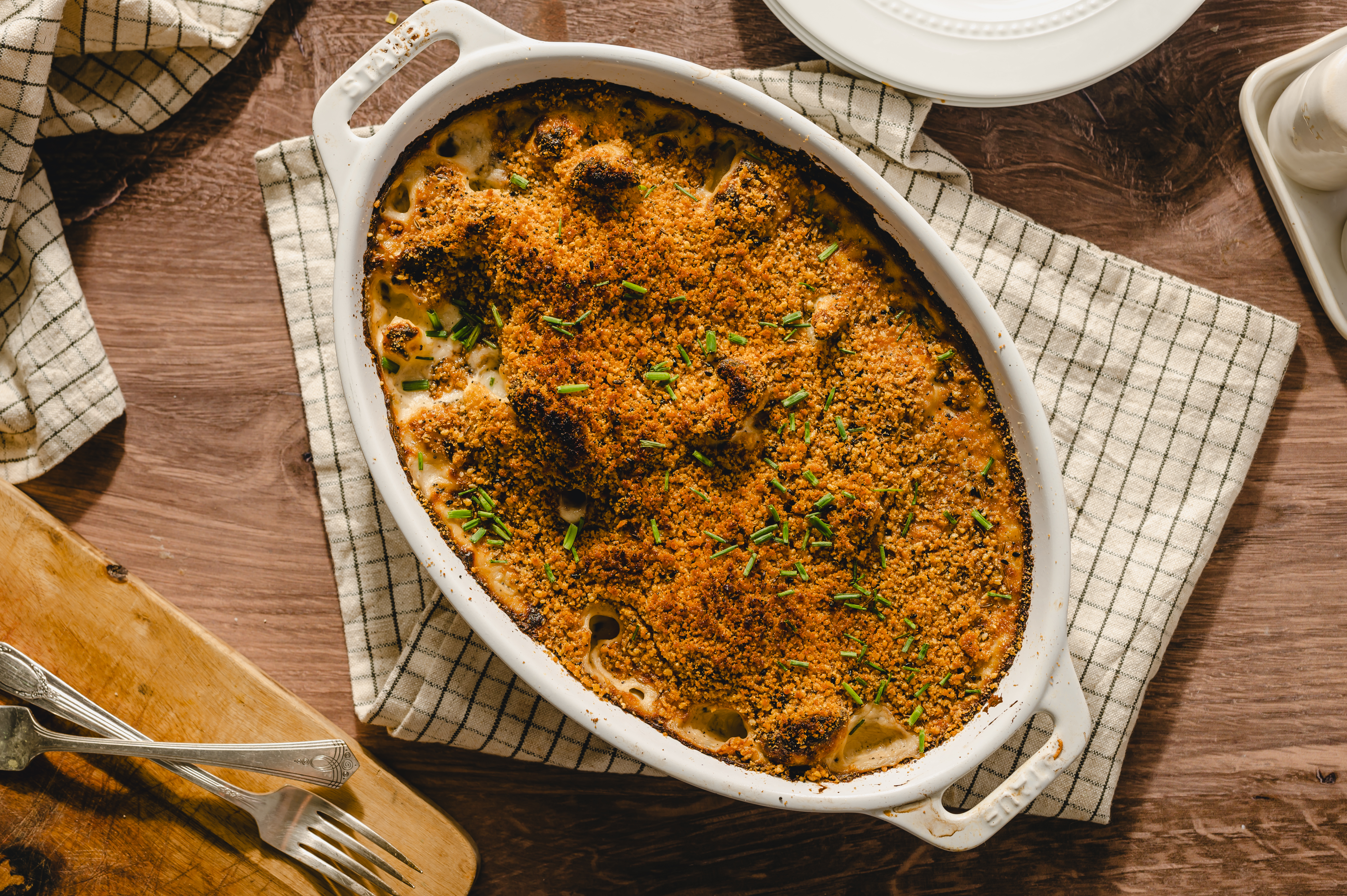Step 8 -Add the cauliflower, 3 tablespoons of the chives, and the cayenne to the sauce mixture and fold to combine.