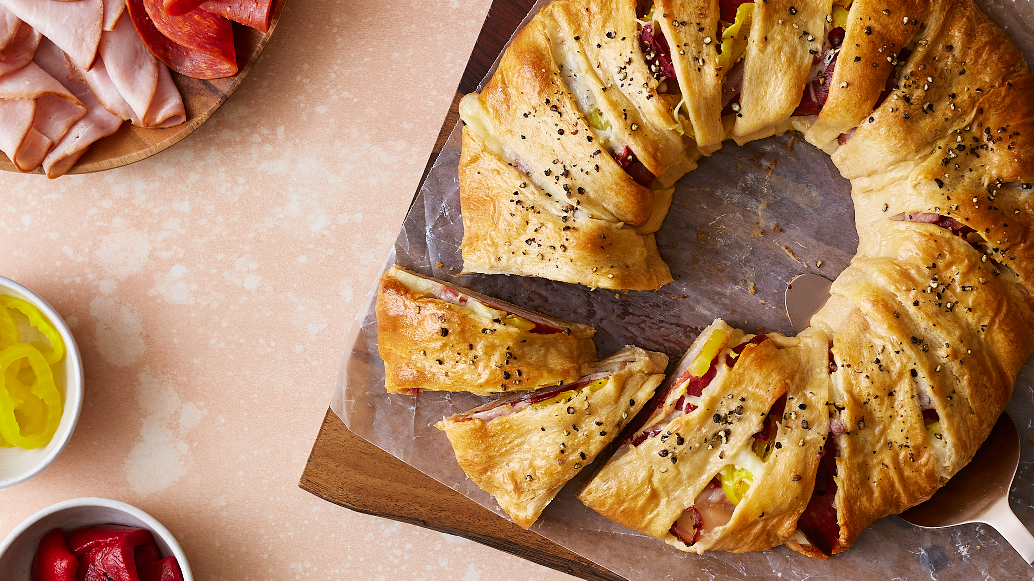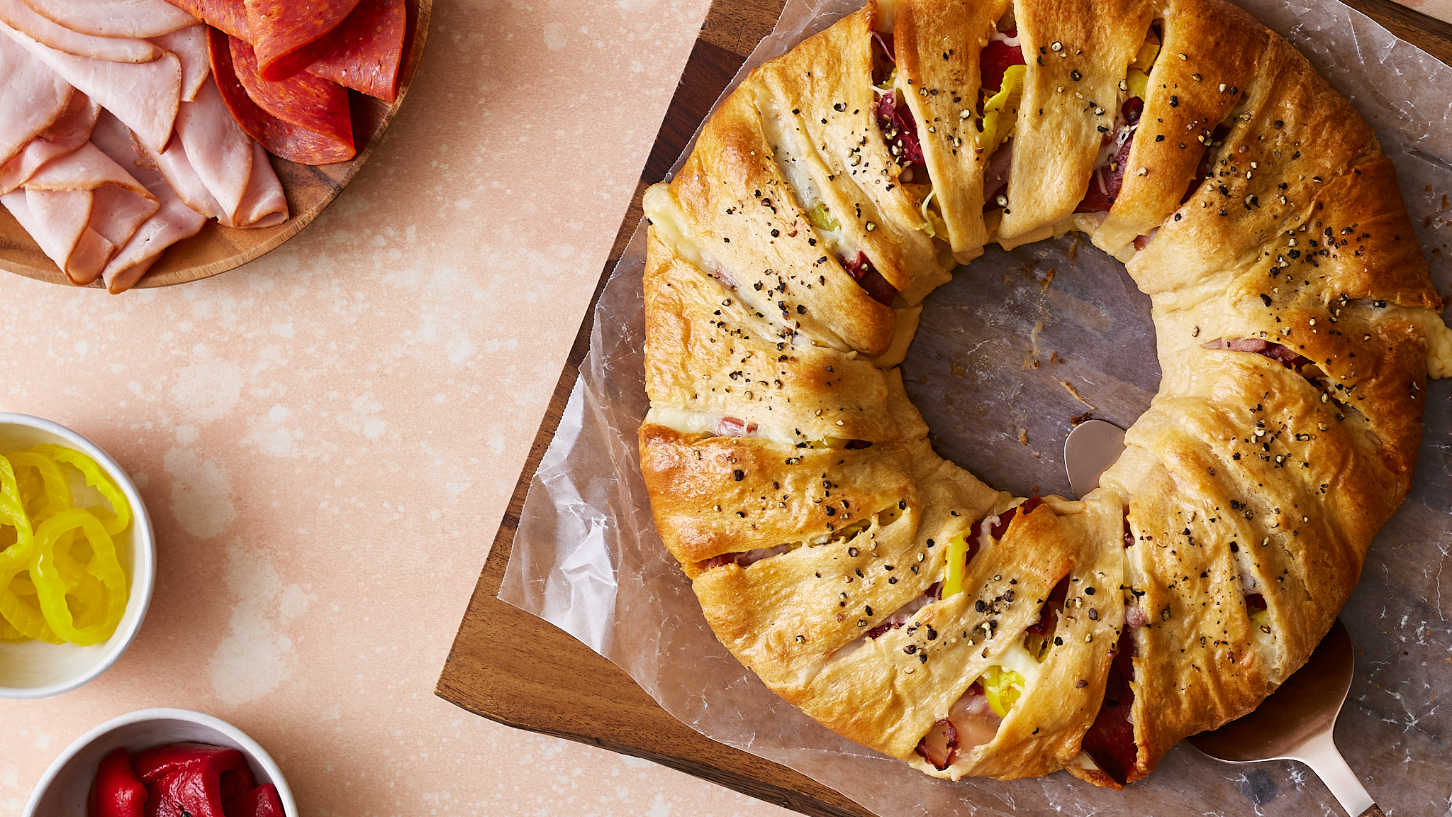 Finally, a snack that can feed a truck of hungry firefighters and have them walking away happy! Firehouse Ring doesn't skimp out on the hearty, savory sandwich favorites; in fact, it piles them high! Melty provolone, spicy pepperoni, succulent ham, hot peppers, all encased in a golden-brown and buttery crust! Firehouse Ring is so good, it's on fire (in a figurative sense anyway)!