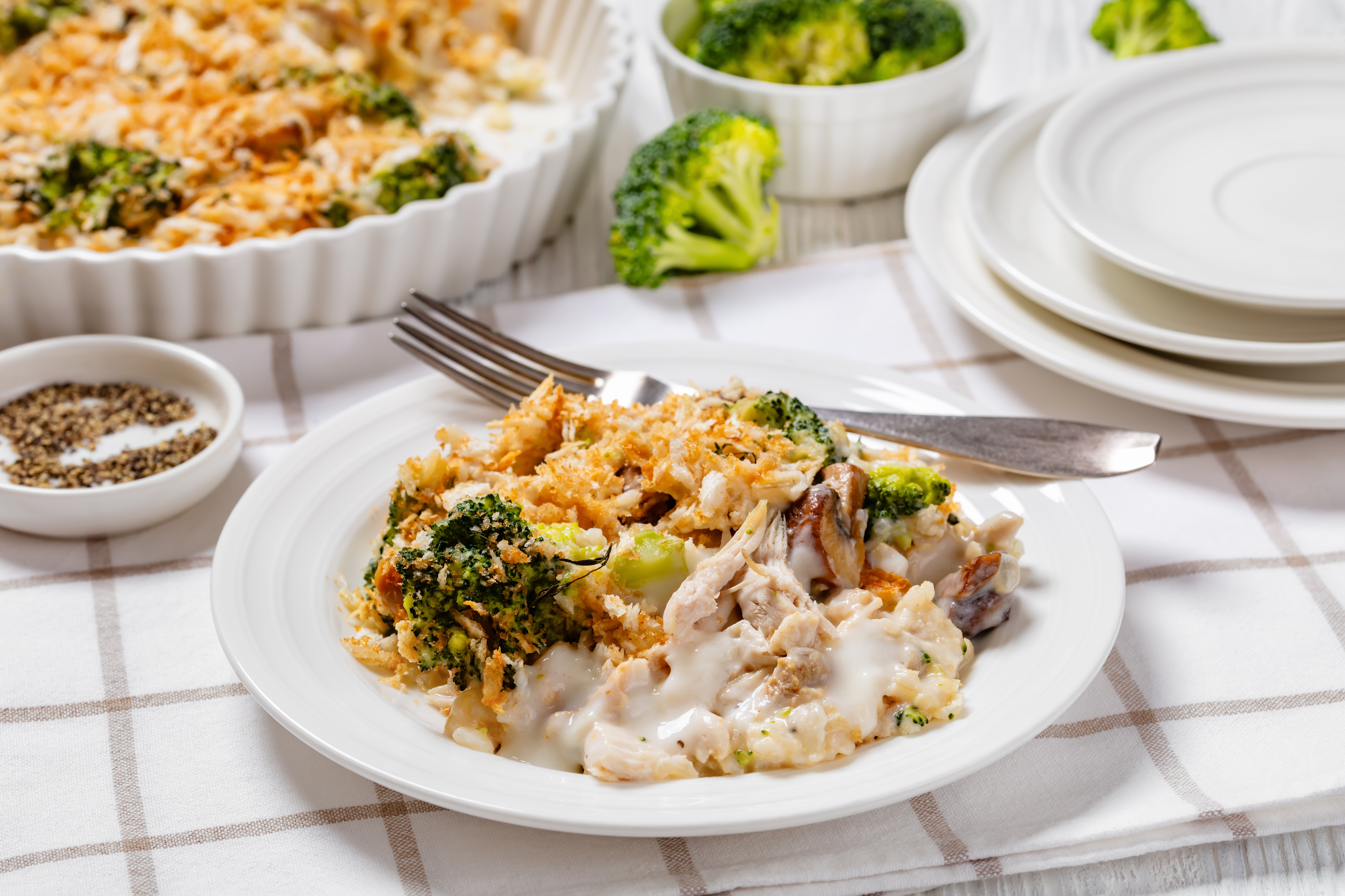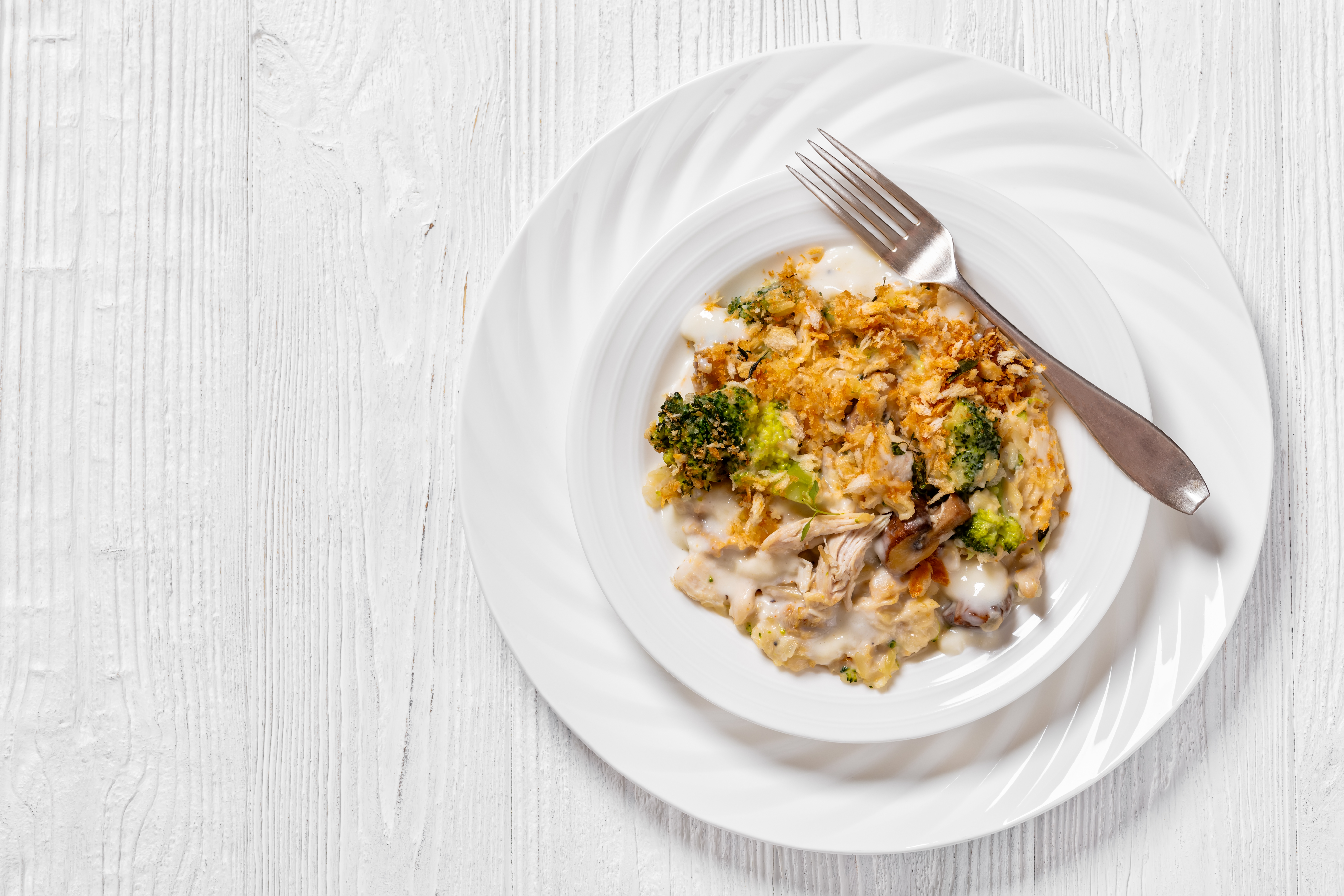 This Gourmet Chicken Bake knows to keep its pinky up and to bring only the best flavors to the plate! Nutty brown rice, refreshing broccoli, smoky Fontina cheese, and beefy mushrooms all join together to dress up the juicy, shredded chicken even more! Top it with some crunchy breadcrumbs and watch the elegant magic happen! Gourmet Chicken Bake brings an upper-class touch to the humble casserole!