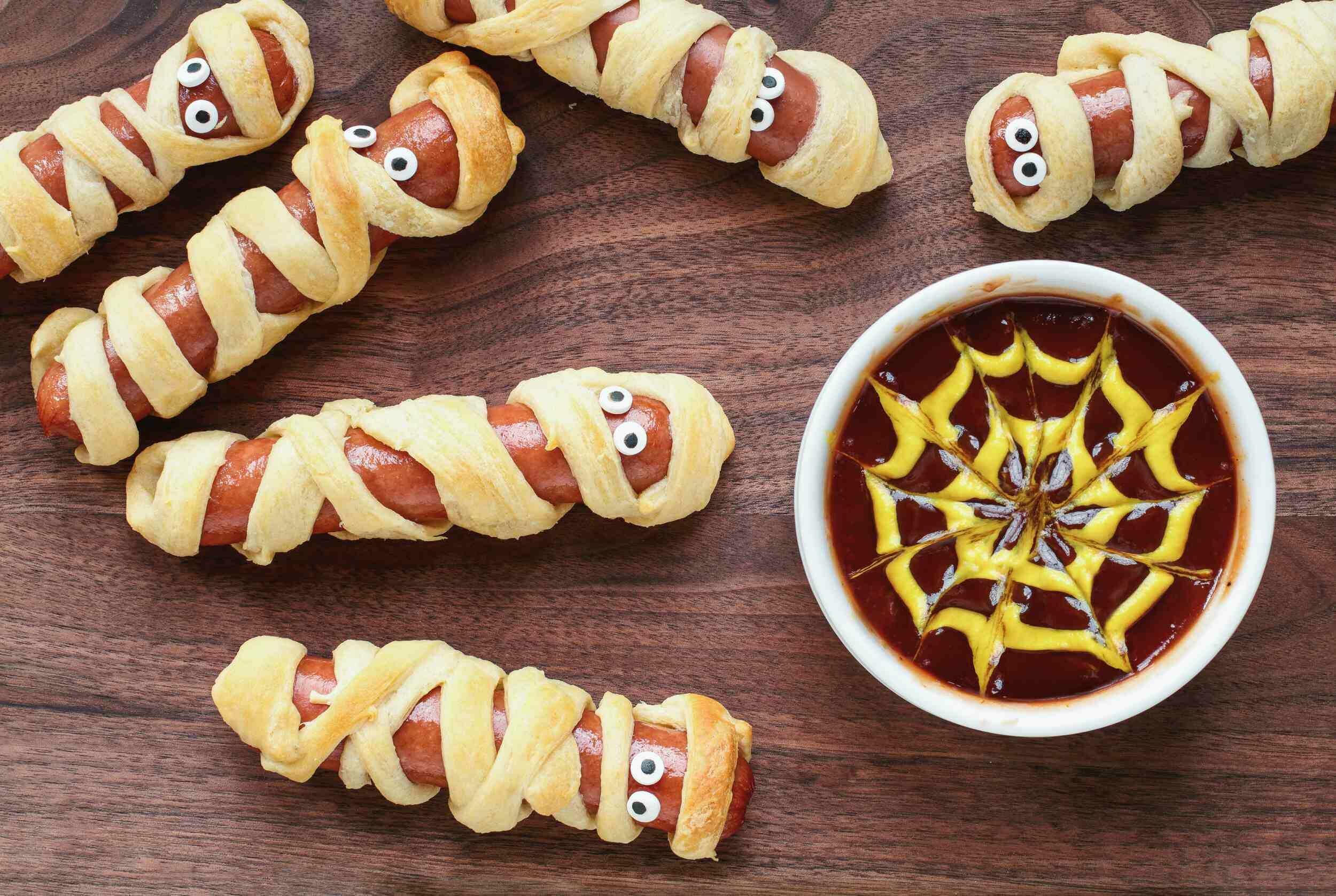 It’s Halloween, and the perfect time for some spooky snacks for the season! Halloween Mummy Dogs are basically pigs in a blanket that have grown to full size: a juicy hot dog wrapped in buttery pastry, which everyone enjoys. With fun goofy mayo eyes, Halloween Mummy Dogs won’t scare you unless you're scared by tasty treats! It’s an easy-to-make and festive twist on the classic hotdog.