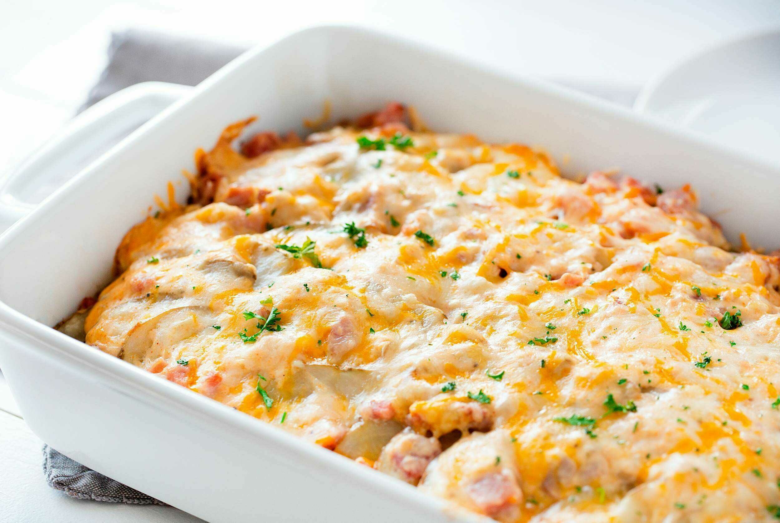 Step 2 -Layer half the potatoes, half the ham, and half the onion in a 2-quart baking dish.