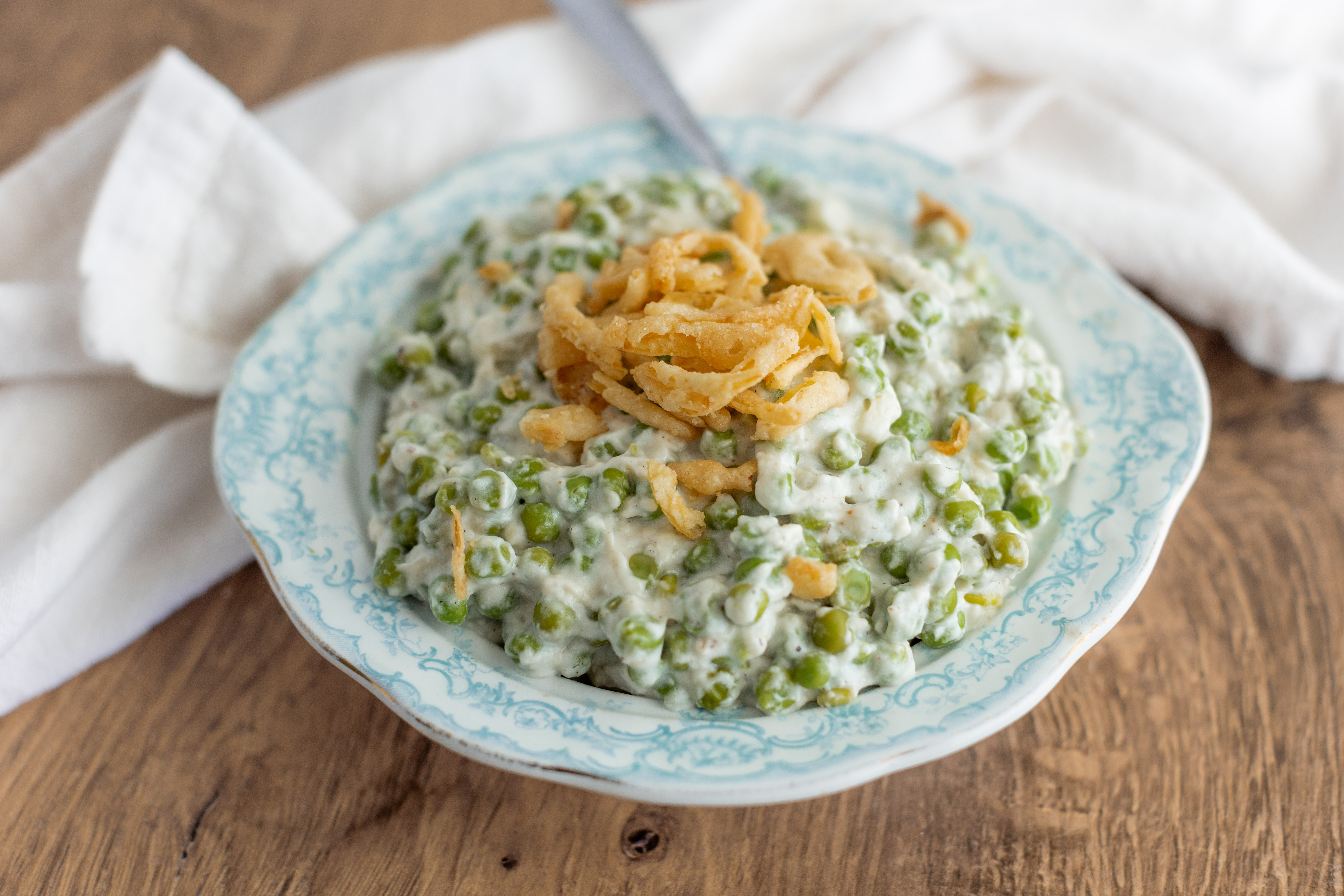 Mmm, a little taste of heaven is in each bite of these Heavenly Creamed Peas. The bright, sweet peas are cooked until tender in a tangy and rich cream sauce, with just the right amount of seasoning. And then on top are clouds of crispy fried onions for crunch and a savory hit of flavor. Place Heavenly Creamed Peas next to steak or fried chicken and you'll find that it has more than earned its wings!