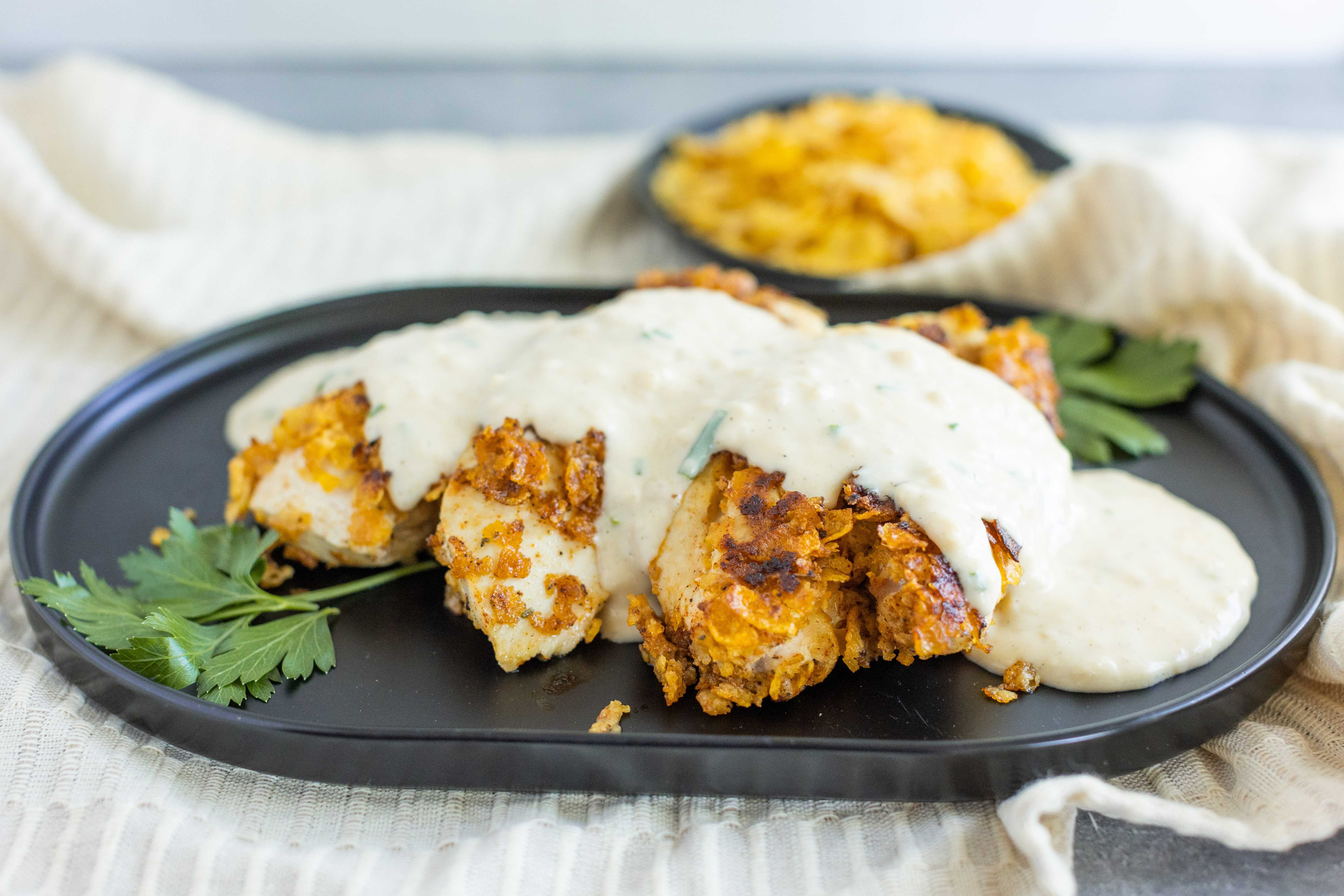 There's nothing like returning to the ranch (so to speak!) knowing there's something delicious and homemade waiting for you for dinner. It's like getting a warm hug or settling into a cozy bed at night... few things compare! That's how it feels to tuck into this Homestyle Chicken & Gravy, a classic dish that warms the heart just as much as it fills the belly! Juicy, savory chicken in a crispy, fragrant cornflake coating and then topped with a rich, thick gravy to really enhance the poultry flavor. Mmm, nothing beats this Homestyle Chicken & Gravy, and that's a fact!
