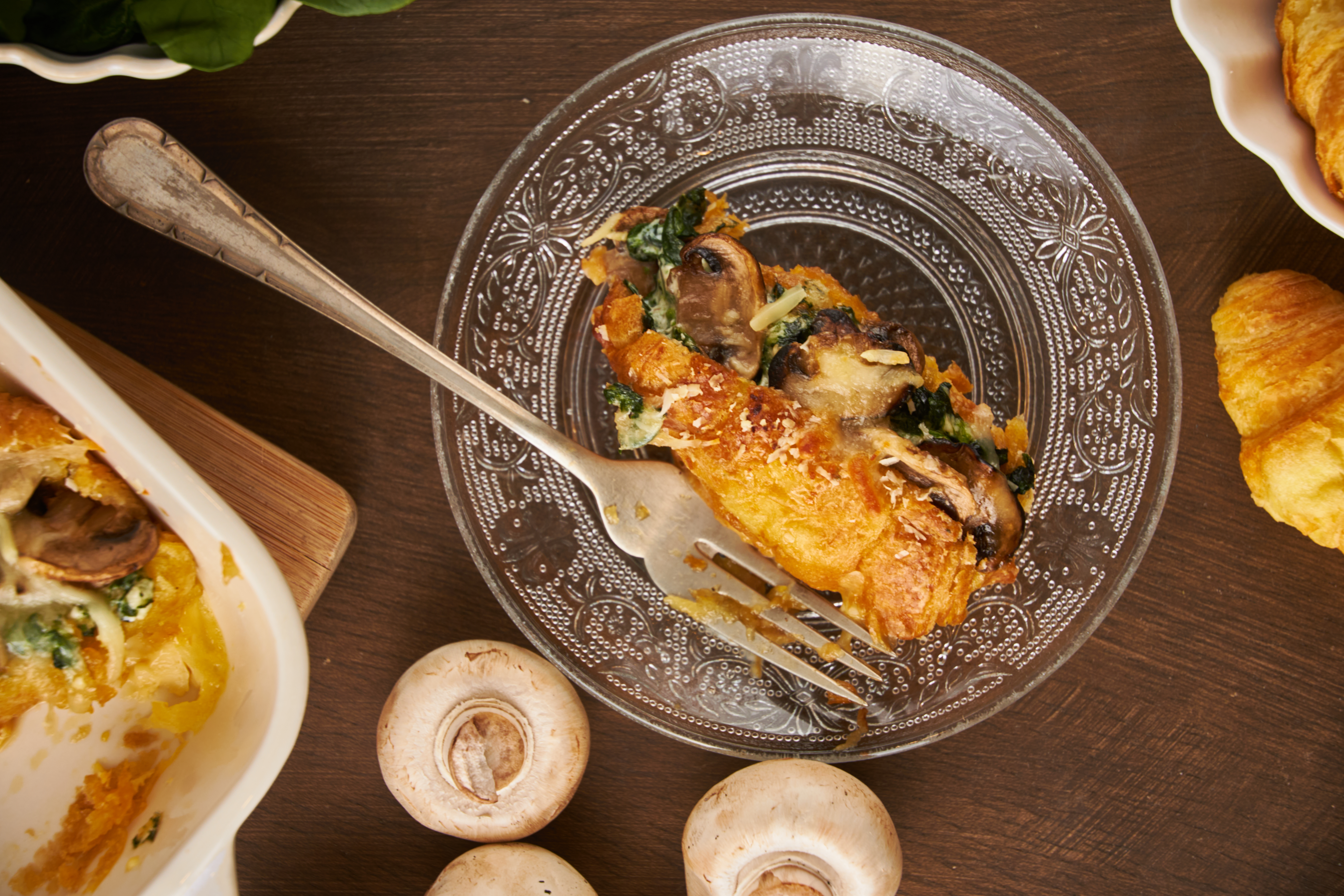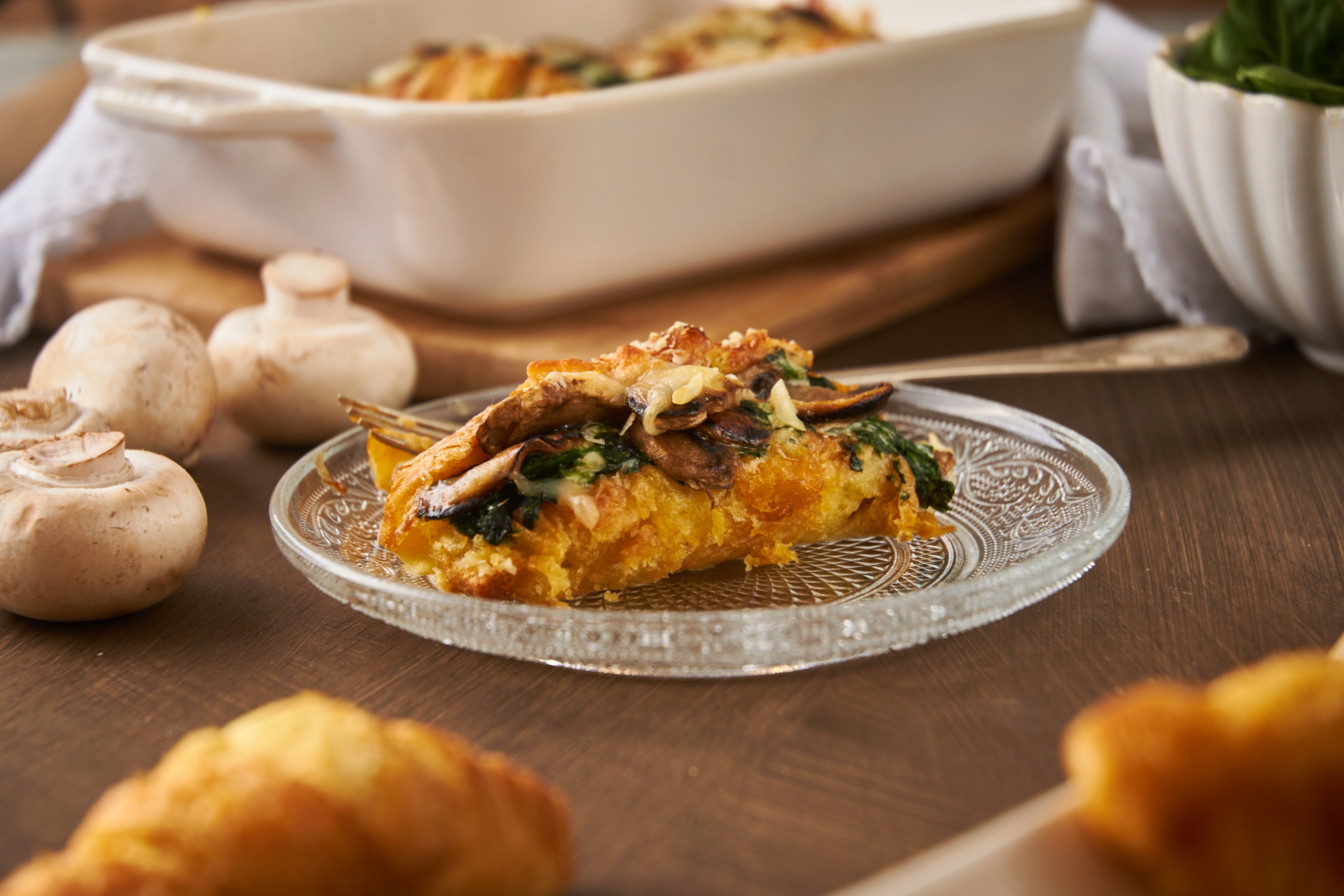 Let's get started out on the right foot today! Let's jump out of bed! Let's get ready in a rush! Let's really get a jump on things, including breakfast! This Jump Start Casserole can be prepared the night before, so all you have to do in the morning is throw it in the oven and let it bake until everything is golden! The eggs are fluffy, creamy, and savory, the baked-in sandwiches are crisp and buttery, and filled with beefy mushrooms and tender spinach. Everything is blanketed in smoky, melty Gruyère cheese, for that extra touch of luxury. Really jump into the flavors of Jump Start Casserole and get ready to jump for joy!