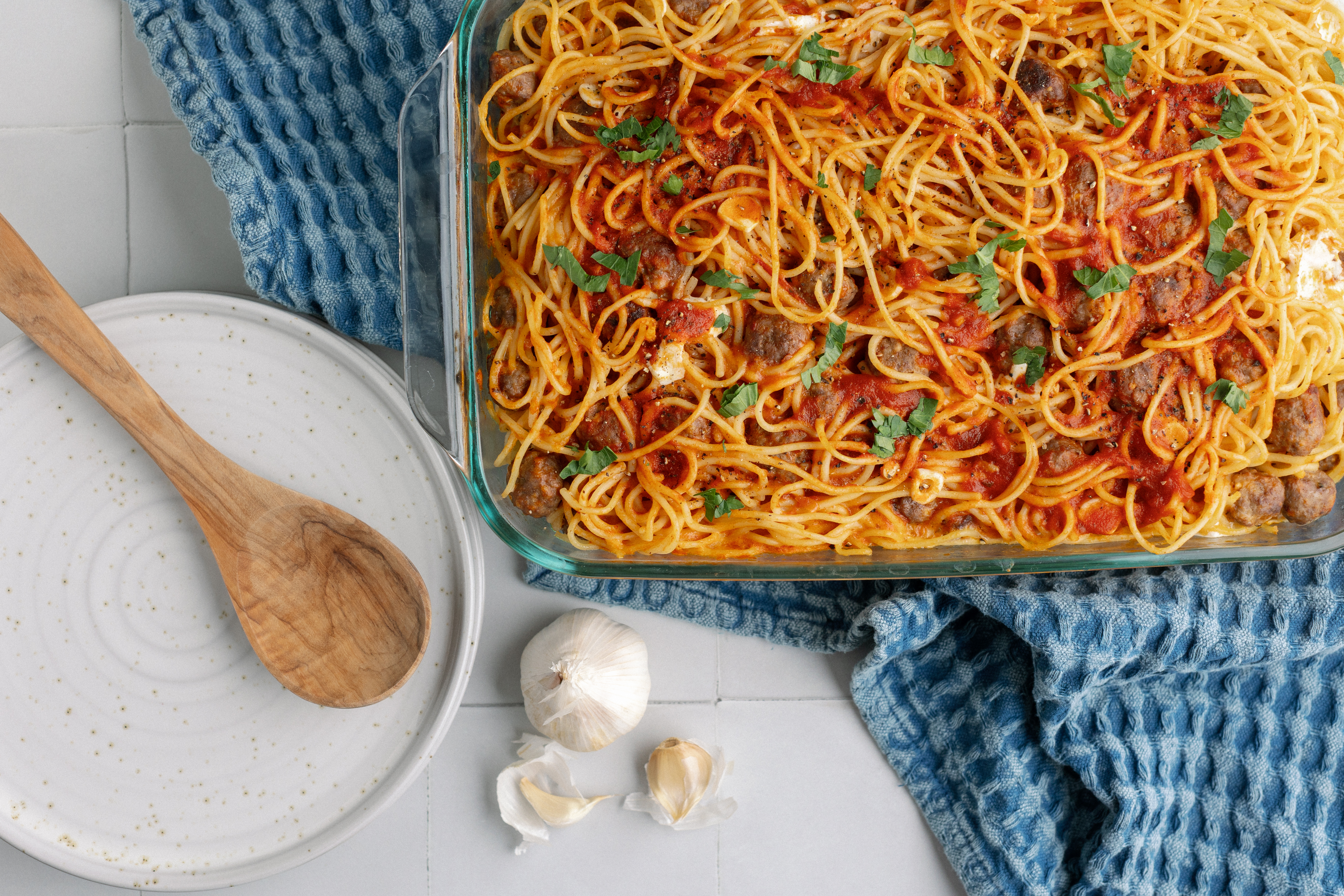 Let's be honest with ourselves; we never grew out of loving spaghetti and meatballs. Why would we? Little spheres of savory, beefy goodness atop a bed of tender spaghetti. Oh, and plenty of mozzarella and parmesan cheese. Now, with the Meatball Spaghetti Bake, we can bring a childhood love into adulthood! The cheesy, melty, sliceable bake contains homemade meatballs and an abundance of fragrant garlic for a true nostalgic trip! Meatball Spaghetti Bake is like childhood wrapped up in casserole form!