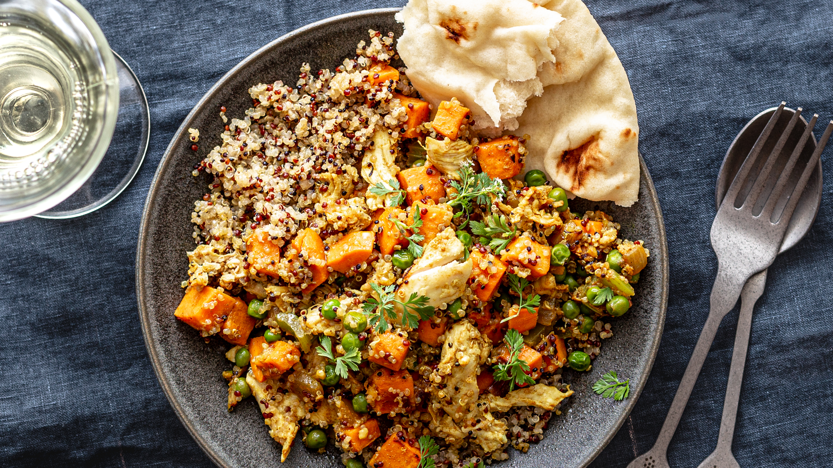 When easy and tasty are on the menu, this will become your go-to, better-than-take-out, nice-and-tidy, stay-at-home staple! This No-Mess Curried Chicken is a quick, any-night, family-loved meal that will definitely end up on repeat. Stocked with flavorful quinoa, tender sweet potatoes, sweet peas, and specially spiced curried chicken, it's a fast-pass out of normal-meal-time town. Spice things up a bit with No-Mess Curried Chicken!