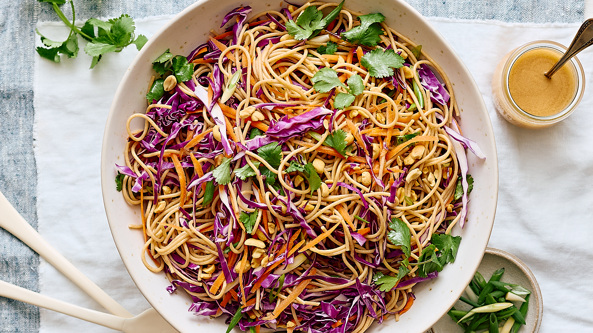 Of course, every summer picnic needs a salad, but why should Caesar salad get all the attention? It's time to shake things up with the Picnic Peanut Noodle Salad! Crisp cabbage, savory green onions, and tender noodles are all great, but it's the dressing that makes Picnic Peanut Noodle Salad so amazing. It's creamy and nutty, with notes of lime and garlic to really take this to new and delicious places! Your picnic is going to be the highlight of the season with this served atop the gingham!