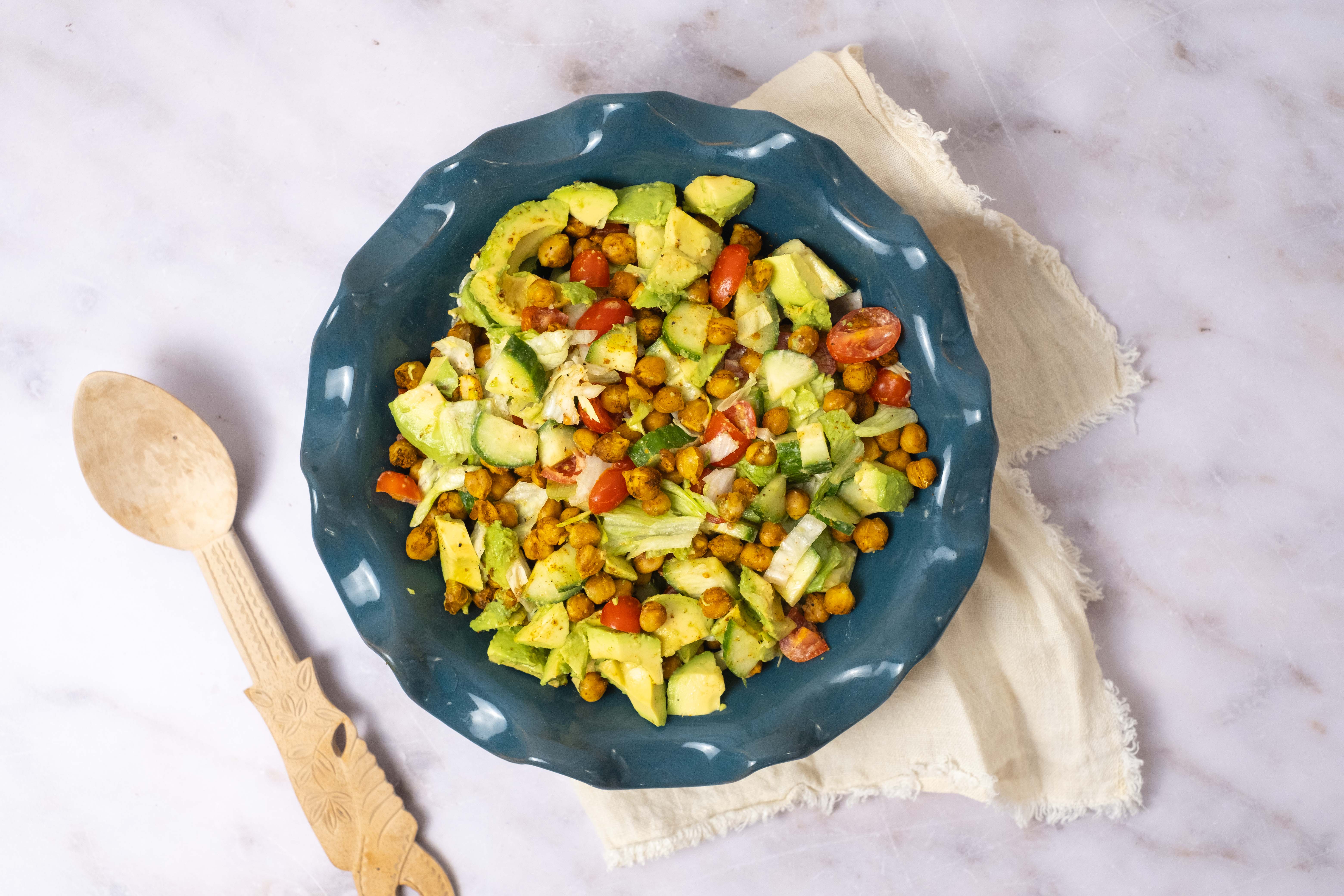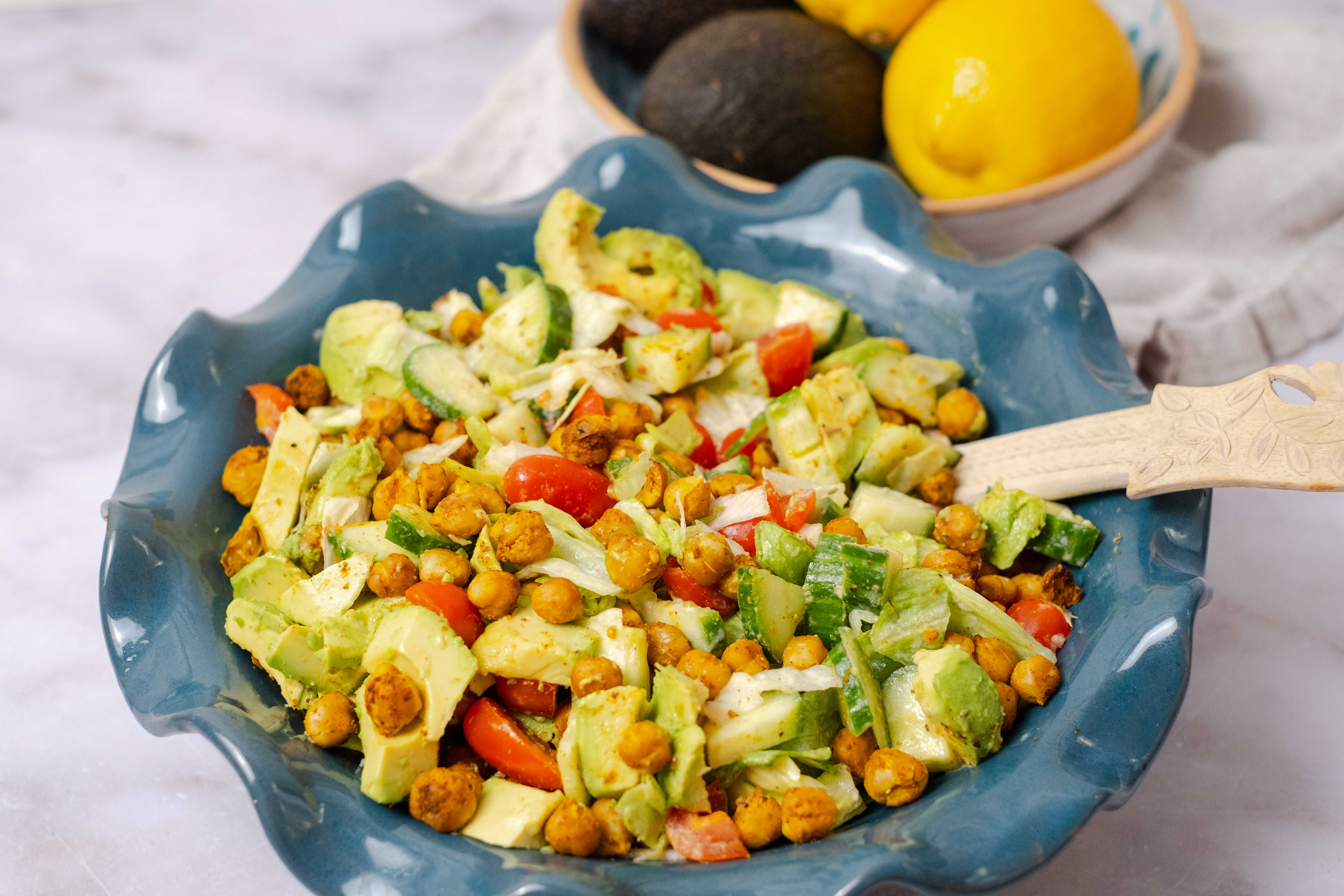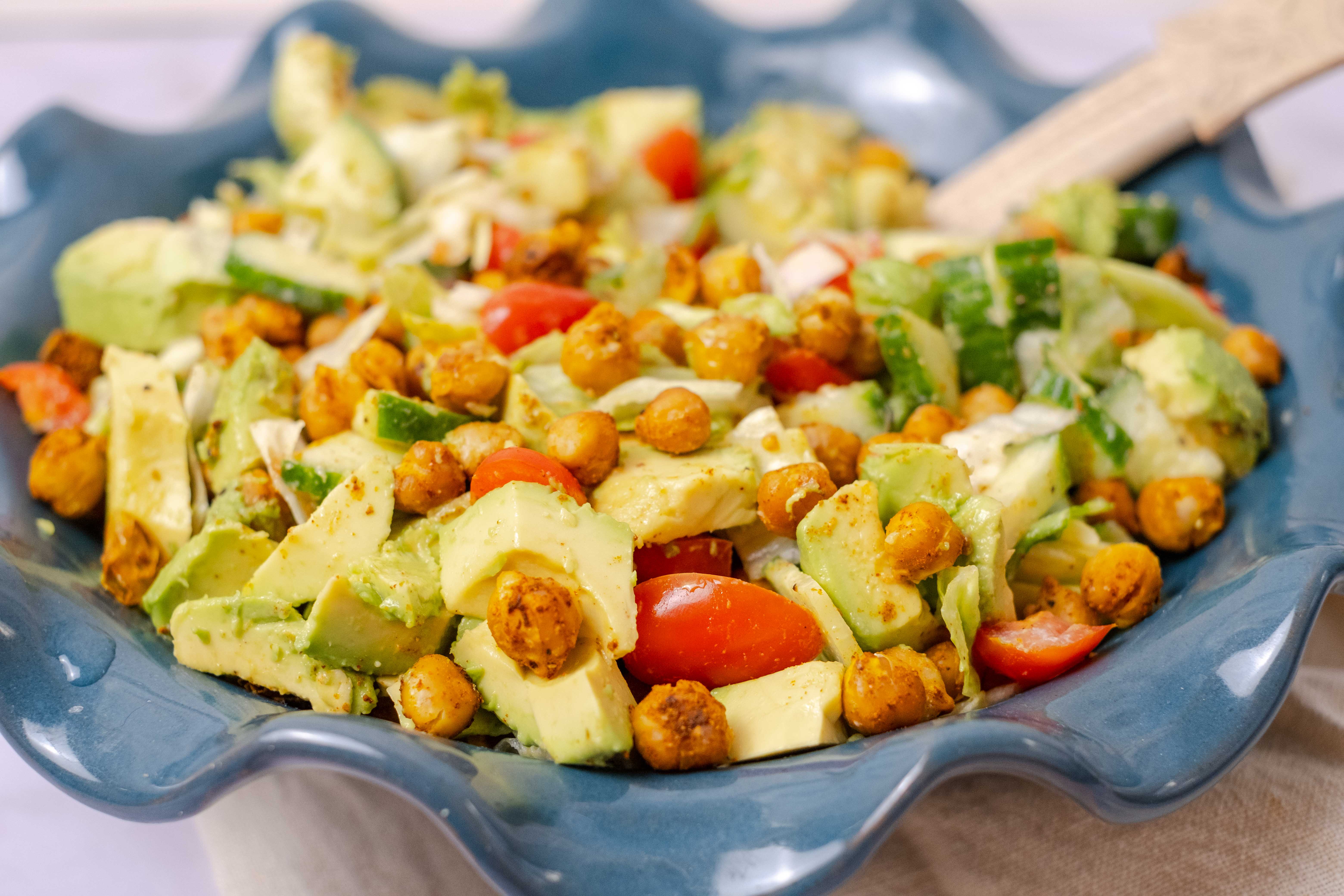 Salads are always a wonderful and easy meal option. Roasted Chickpea Salad adds just the right punch to keep your salad menu fresh and interesting. Crisp, chopped lettuce is tossed with a zesty, lemon-infused dressing and topped with seasoned, roasted chickpeas, juicy cherry tomatoes, crunchy English cucumbers, tasty avocados, and more of that dressing to give every bite a full flavor rush! Roasted Chickpea Salad is great for a quick dinner for your family or a shareable potluck dish that everyone will devour. It's oh, so good!