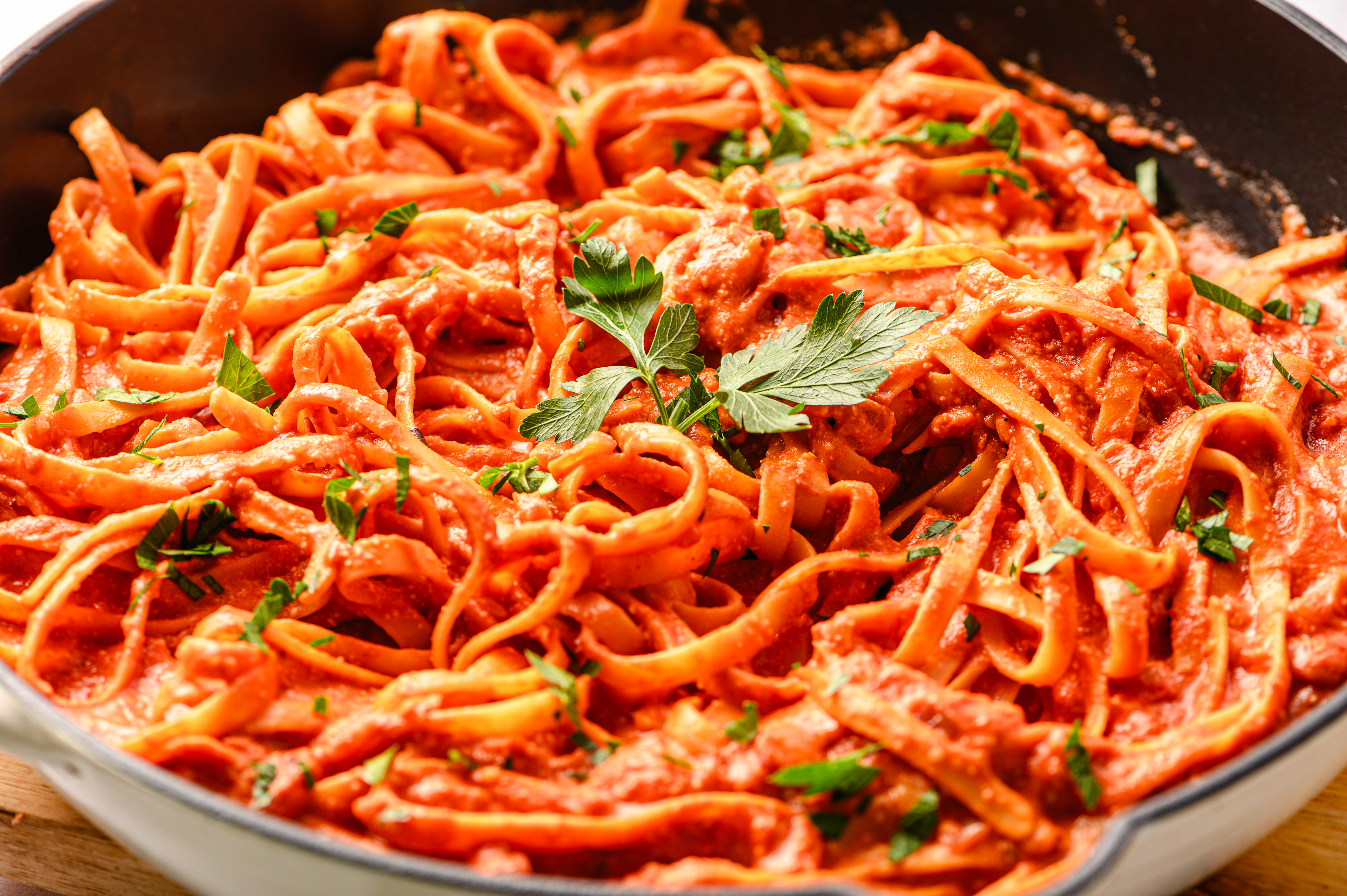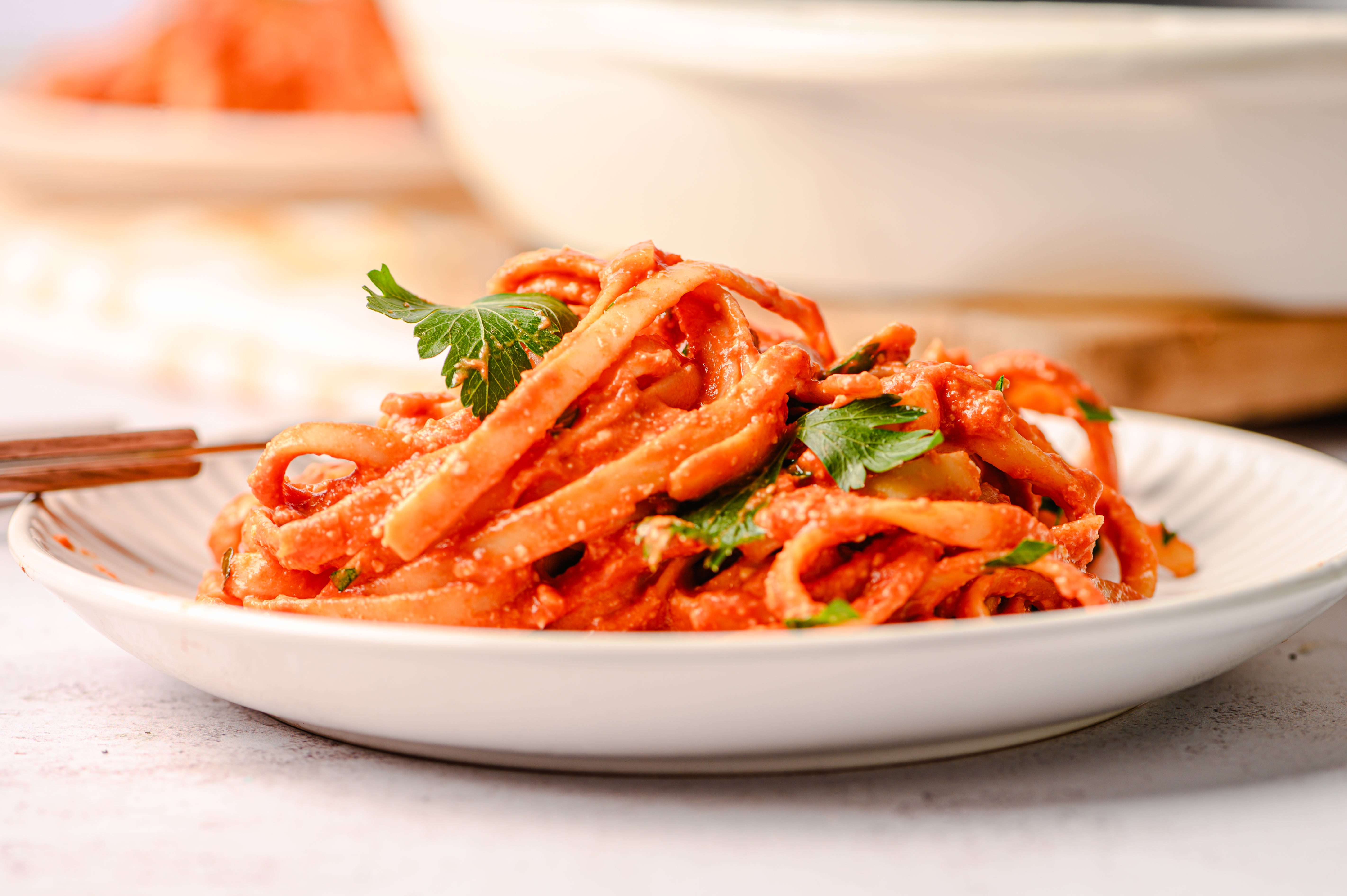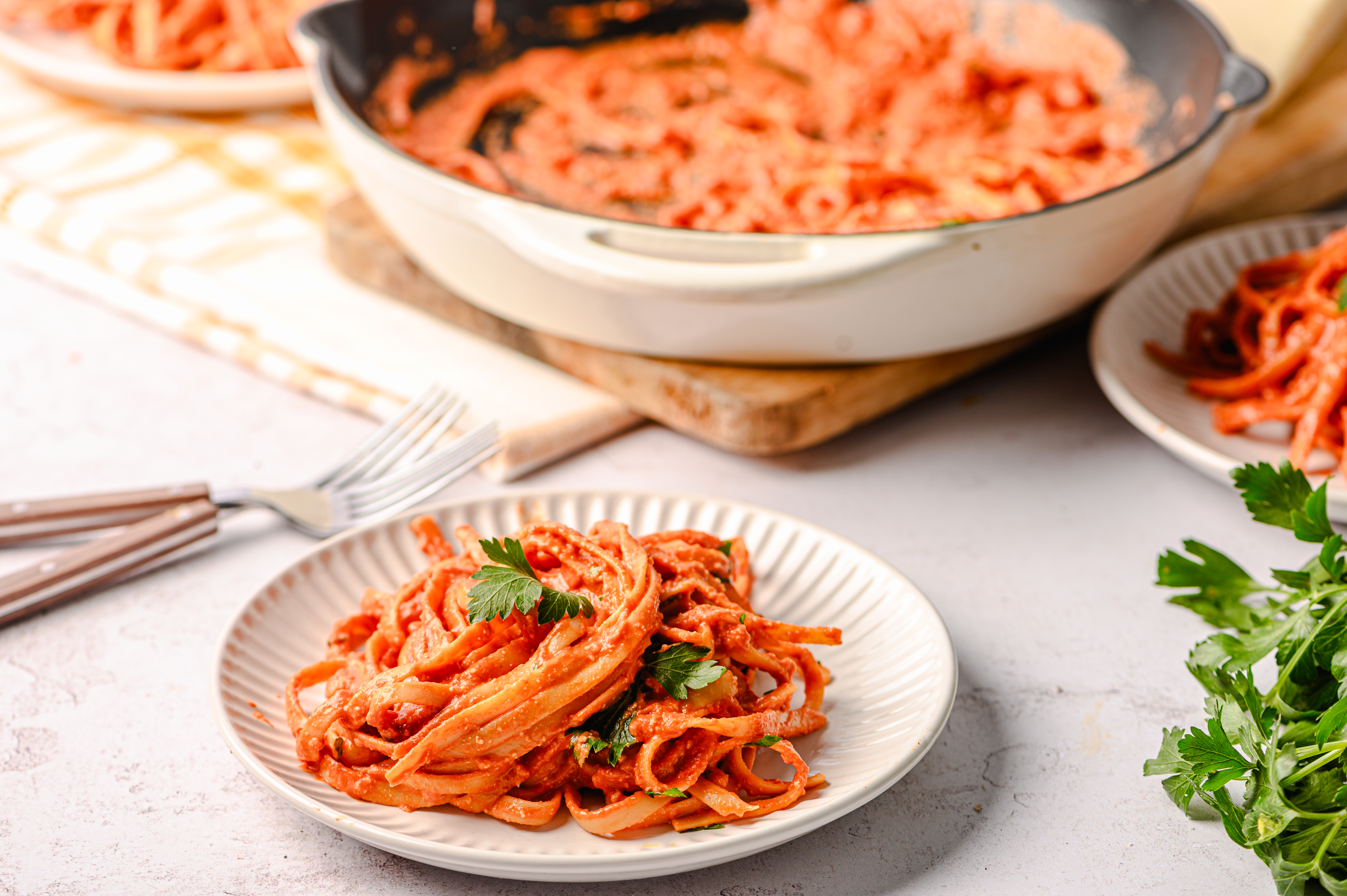 Date night doesn't need to require going out on the town or breaking the bank. All it needs is something special shared between you and your loved one, a dish that blushes the way you do when you see them. Romance Pasta is simple and elegant and just plain delicious; a creamy, rich, vibrant tomato sauce with notes of parmesan and garlic coating tender pasta. The pink hue of Romance Pasta will certainly conjure up the feeling of candlelit dinners, whether you have candles or not! Share in the warm and fuzzy feelings!