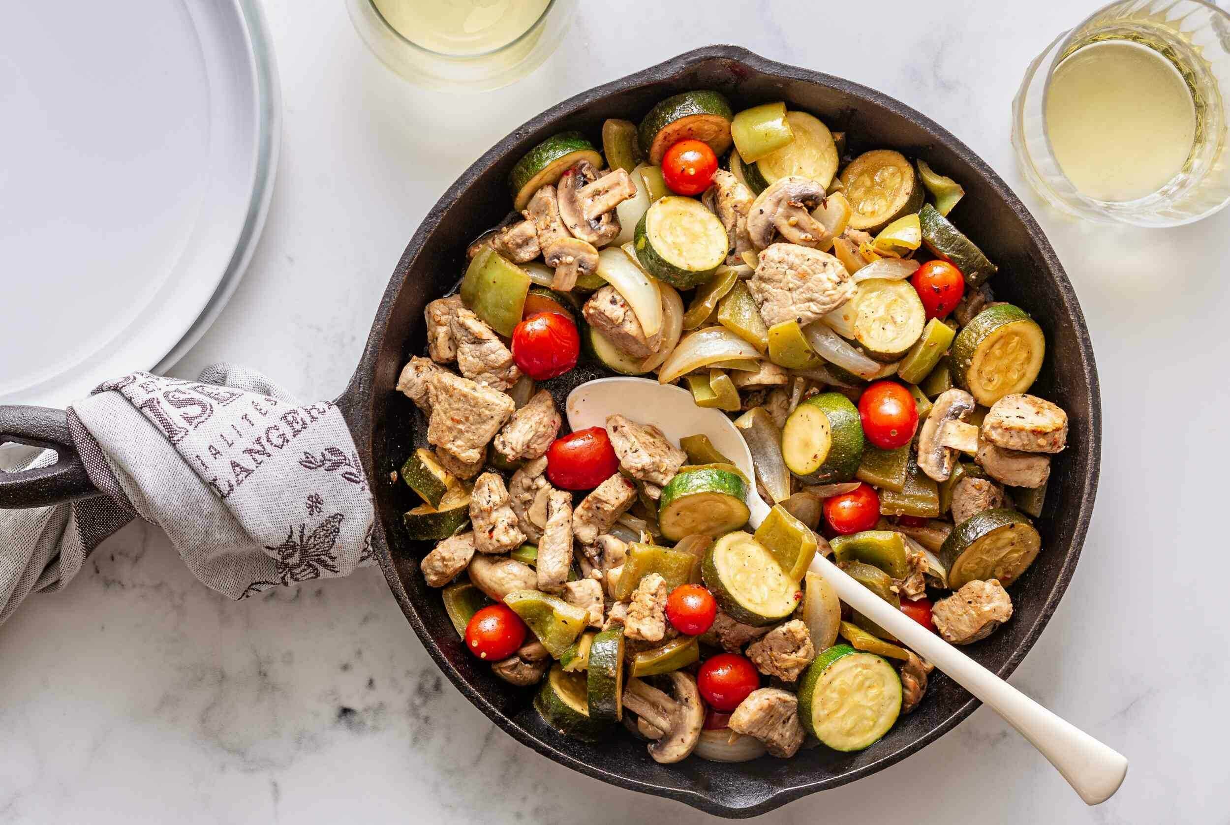 Here's the situation: you want a classic pork kebab and you can't grill right now; it might be raining, the grill might be non-cooperative, or maybe you just can't motivate yourself to get the grill fired up. What do you do? Enter Skewerless Pork Kabobs! The pork is still golden-brown, crisp, and juicy, and the green peppers, zucchini, and tomatoes add garden heartiness and brightness to make the meat flavors even bolder. Cooked in tangy, herbaceous Italian dressing, with Skewerless Pork Kabobs you don't even need to worry about marinating time; they can be on the table in 30 minutes or less and without breaking a sweat. Sometimes the simple solution really is the best... or better!