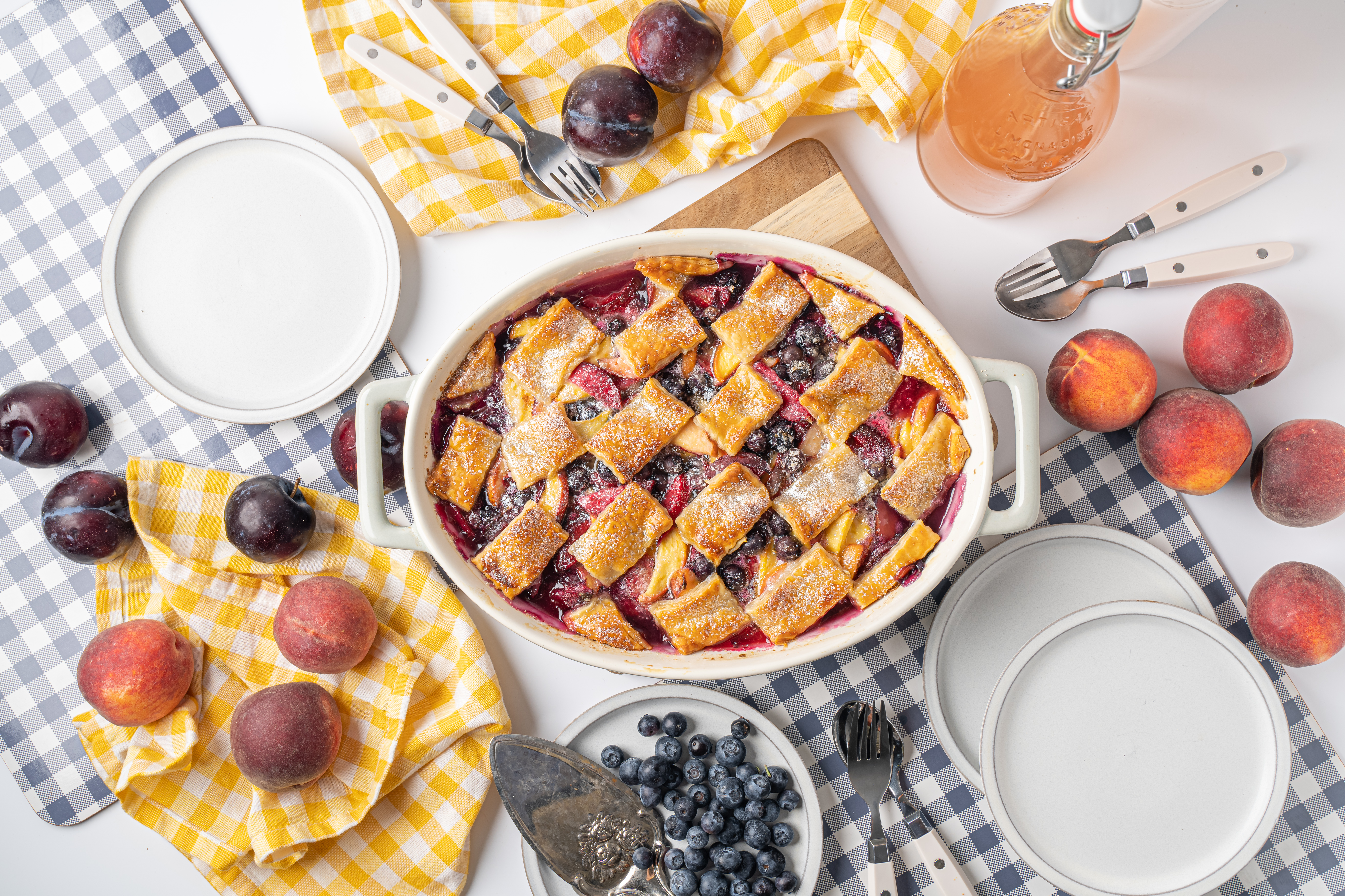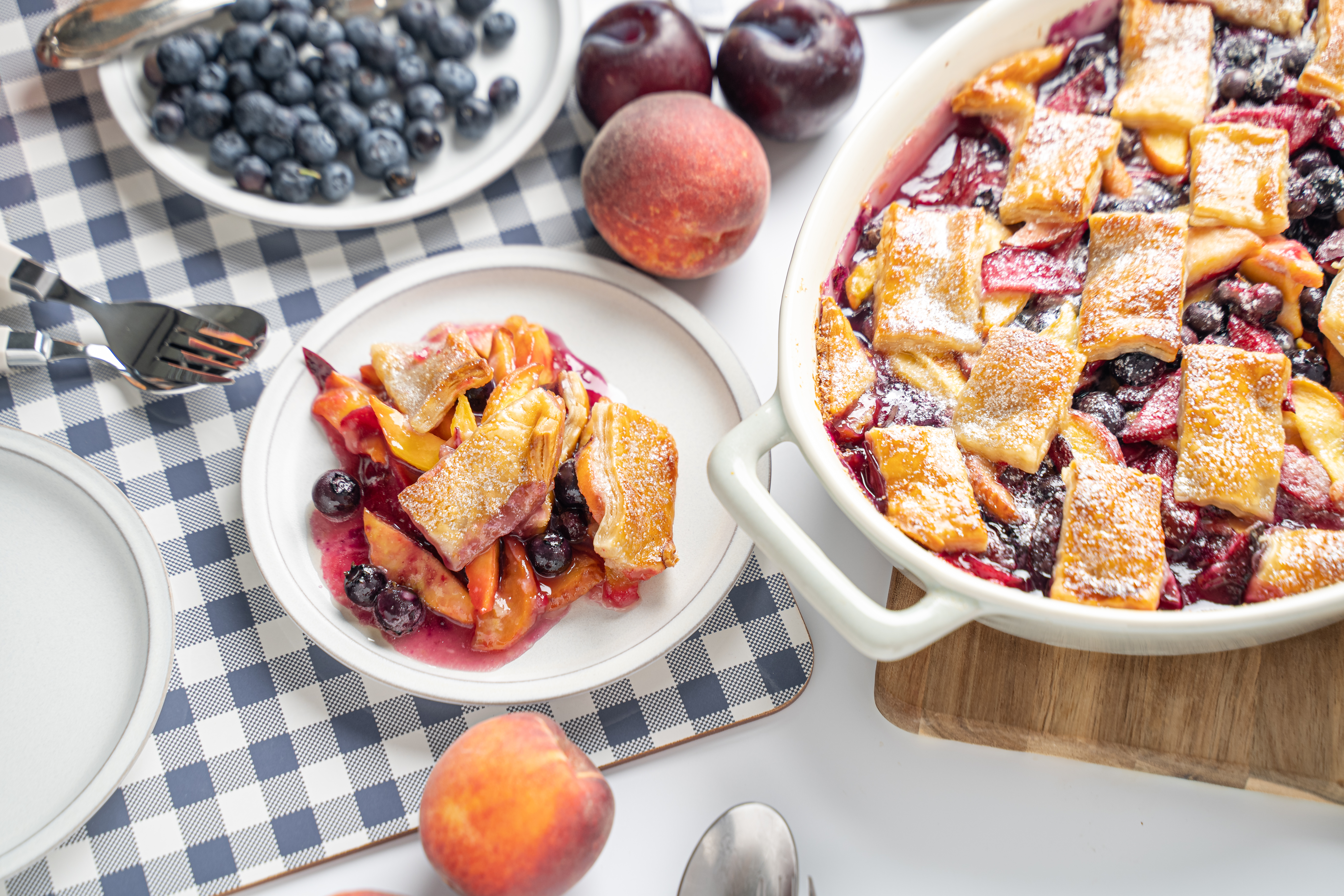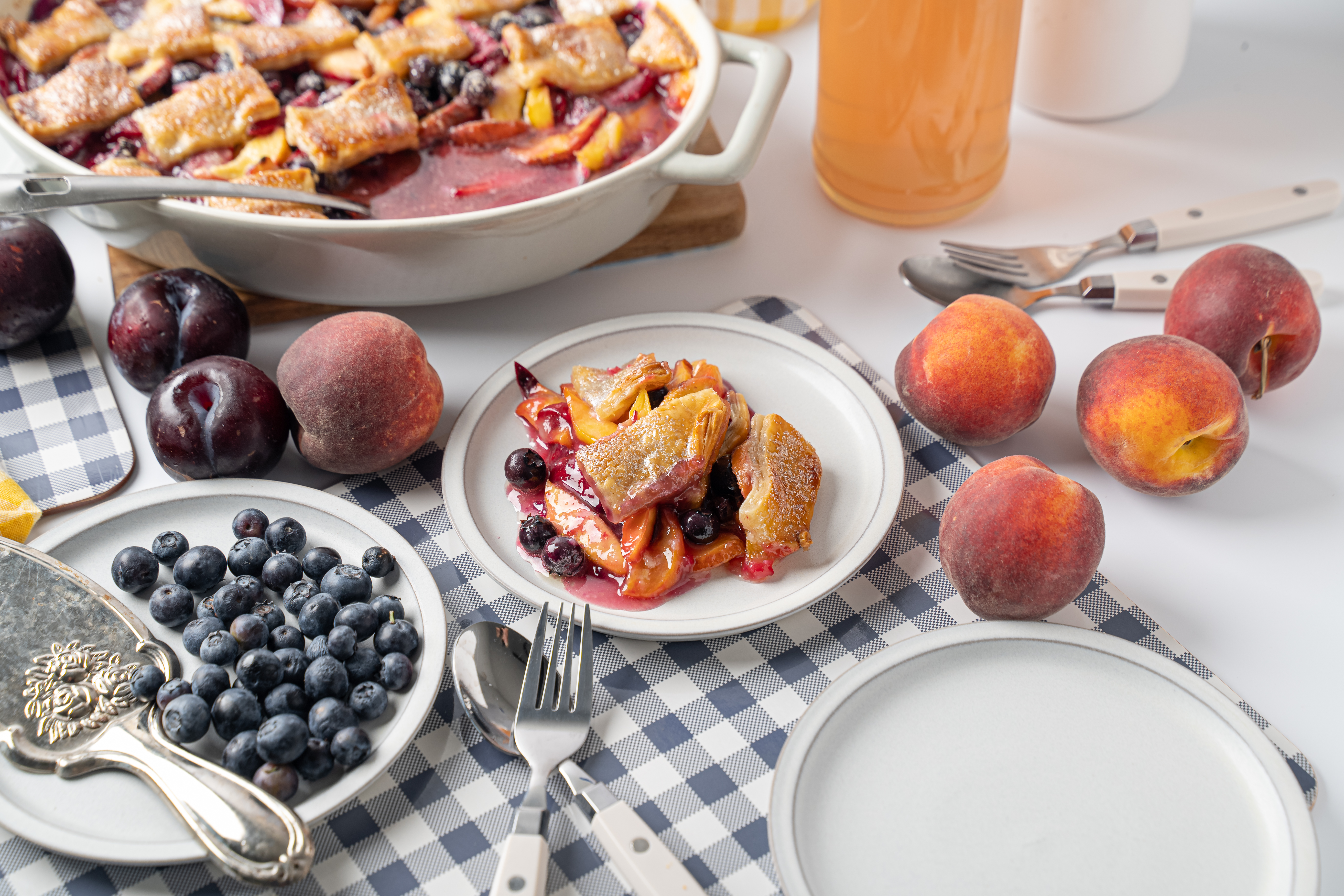 Summer Patchwork Cobbler has everything you want out of a summer dessert! The filling is a mixture of everyone's favorite summertime fruits: floral peaches, bright blueberries, and juicy plums, enhanced with hints of vanilla and baked until jammy and sweet. On top is a quilt of buttery, flaky dough sprinkled with sugar for a delightfully crunchy texture. Summer Patchwork Cobbler is a work of art, much like an idyllic picture of the season... except you can eat it!