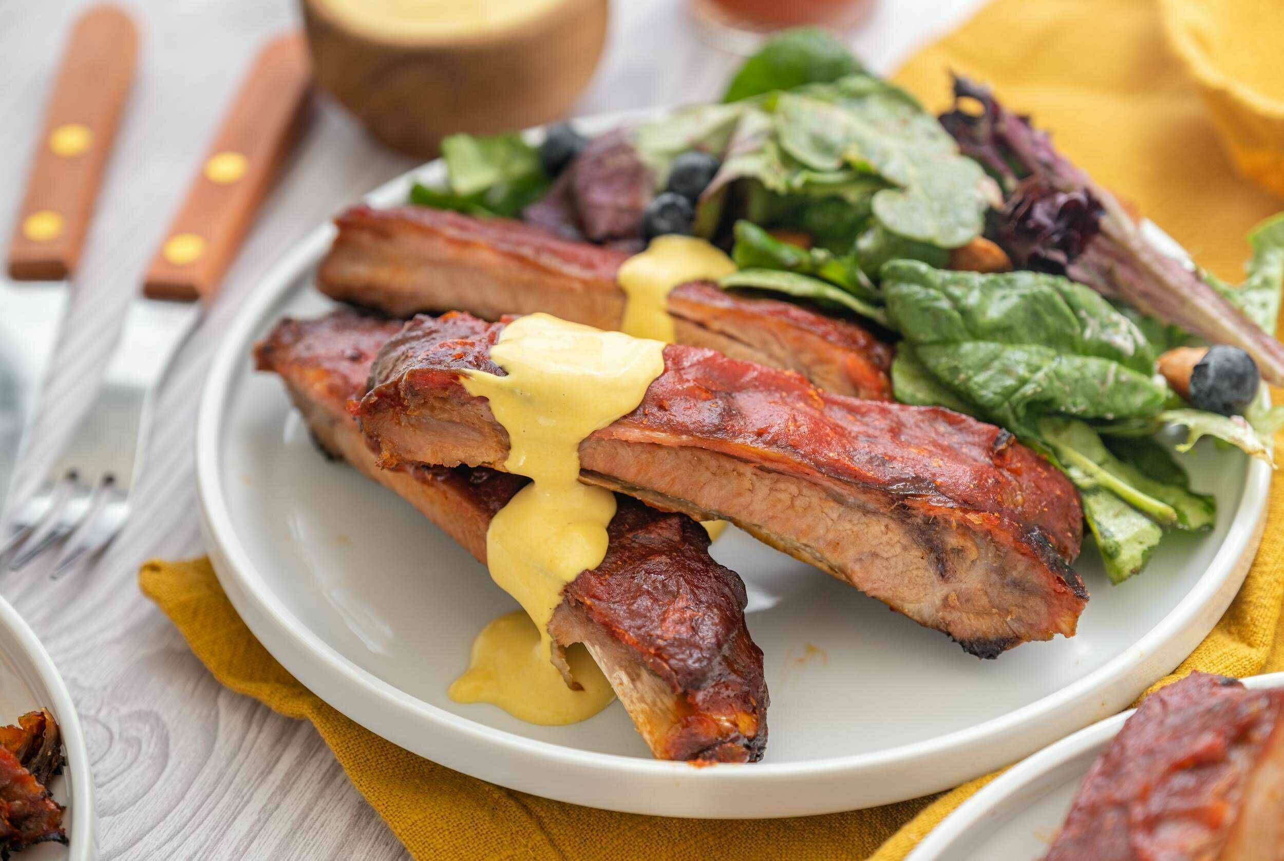 The tang of Tangy Ribs doesn't just perk up your tastebuds (although they'll be wide awake and ready for more from the first bite). It accents and highlights the notes of sweetness, savoriness, and spice from the Worcestershire-mayo-and-mustard sauce and the fragrant spice rub. Let's not forget that the tang of Tangy Ribs brings out the most of the juicy, oven-cooked ribs. So the tang of Tangy Ribs isn't just fun to say: it's the secret to why everyone will be crowding around the table and reaching to grab a helping!