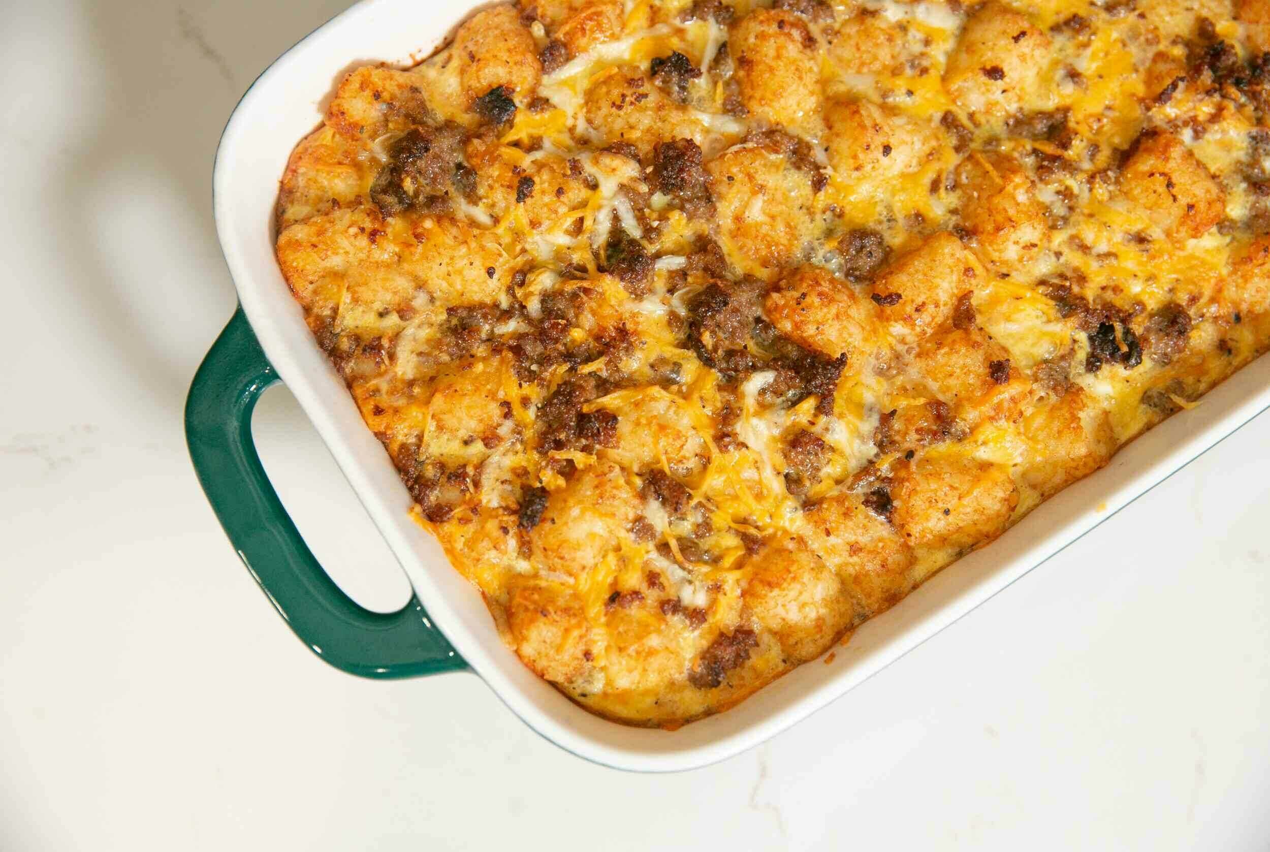 Step 5 -In a large mixing bowl, toss together the tater tots, the cooked sausage, the cheddar cheese, and the mozzarella cheese.