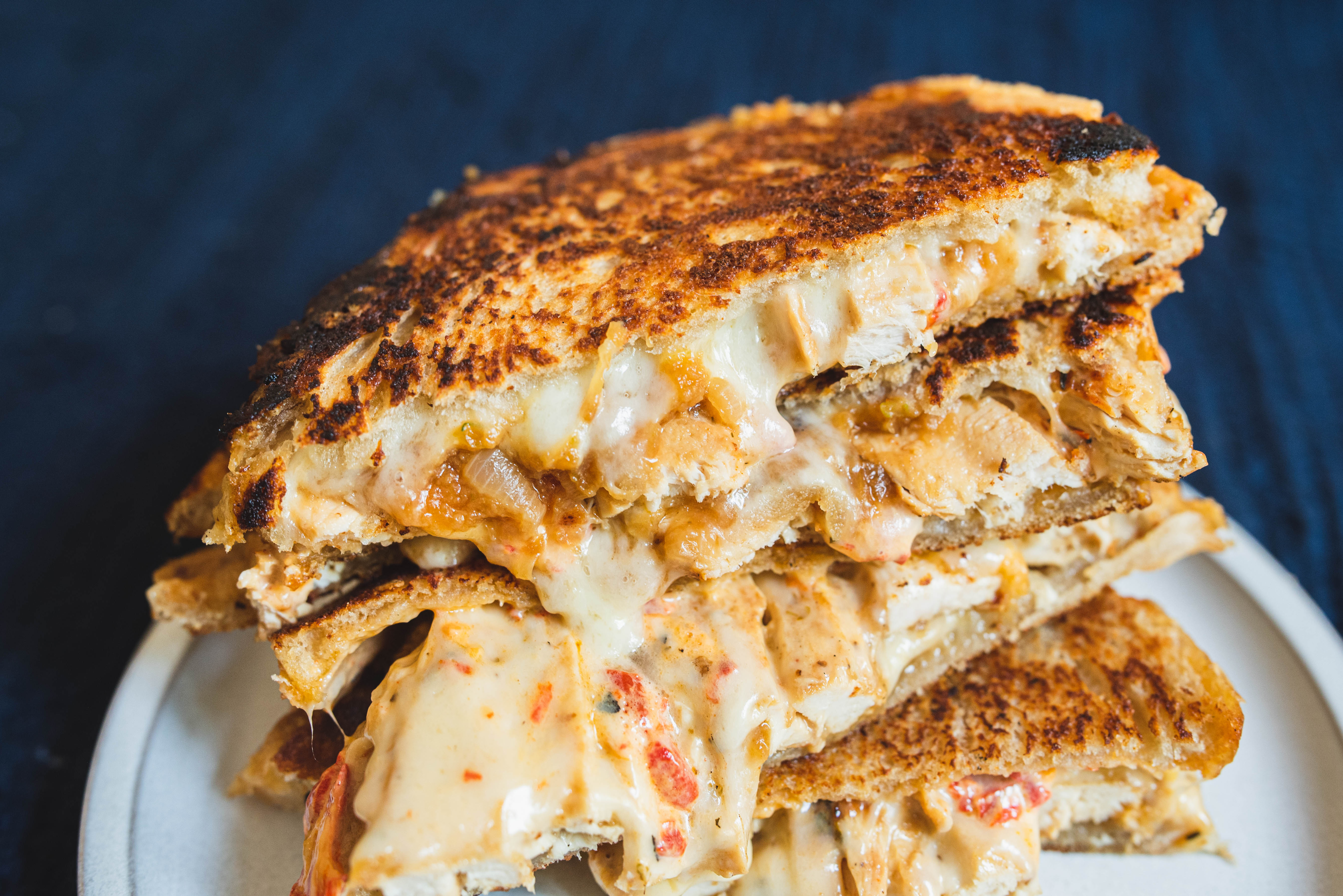 Step 11 -Layer each of the mayonnaise-covered slices of bread with 1 slice of the cheese, some of the chicken, some of the onions, and 2 more slices of the cheese.