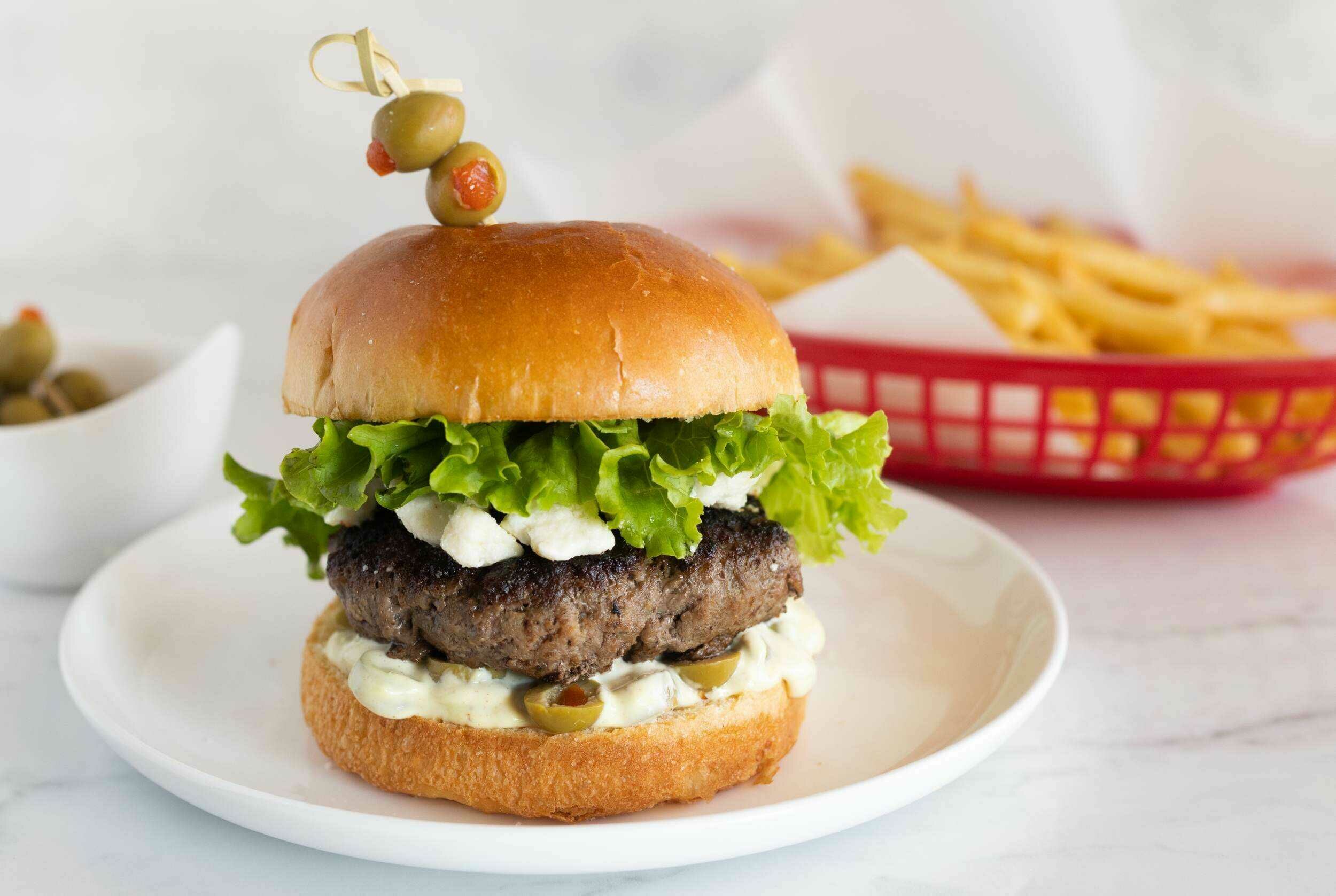 Step 6 -Serve the burgers on the buns with the olive mixture, the feta cheese, and the bibb lettuce.